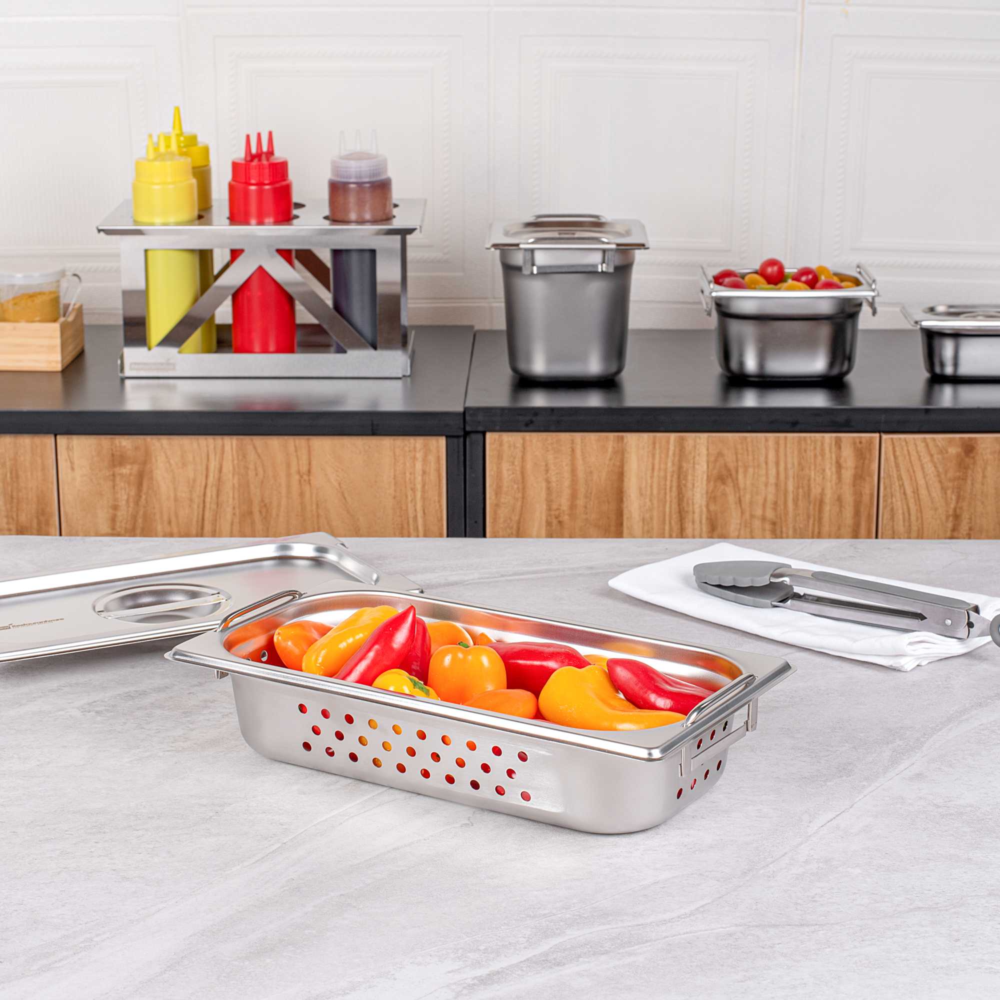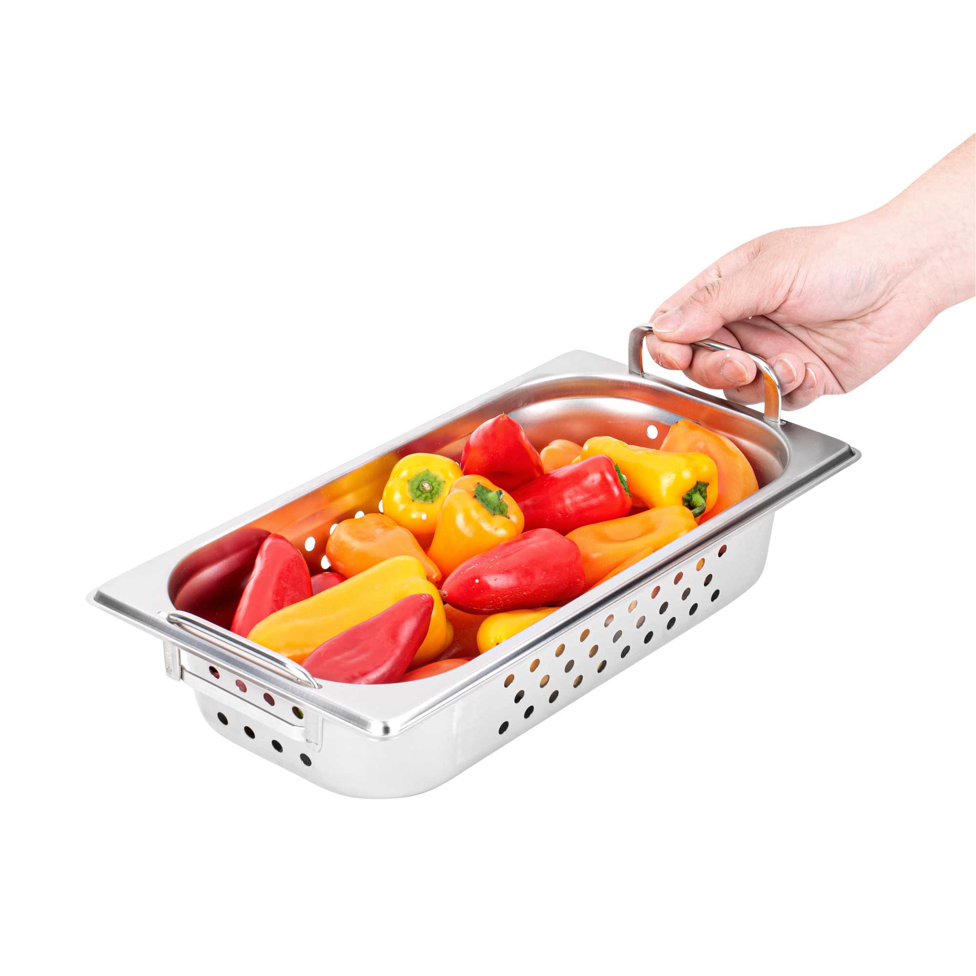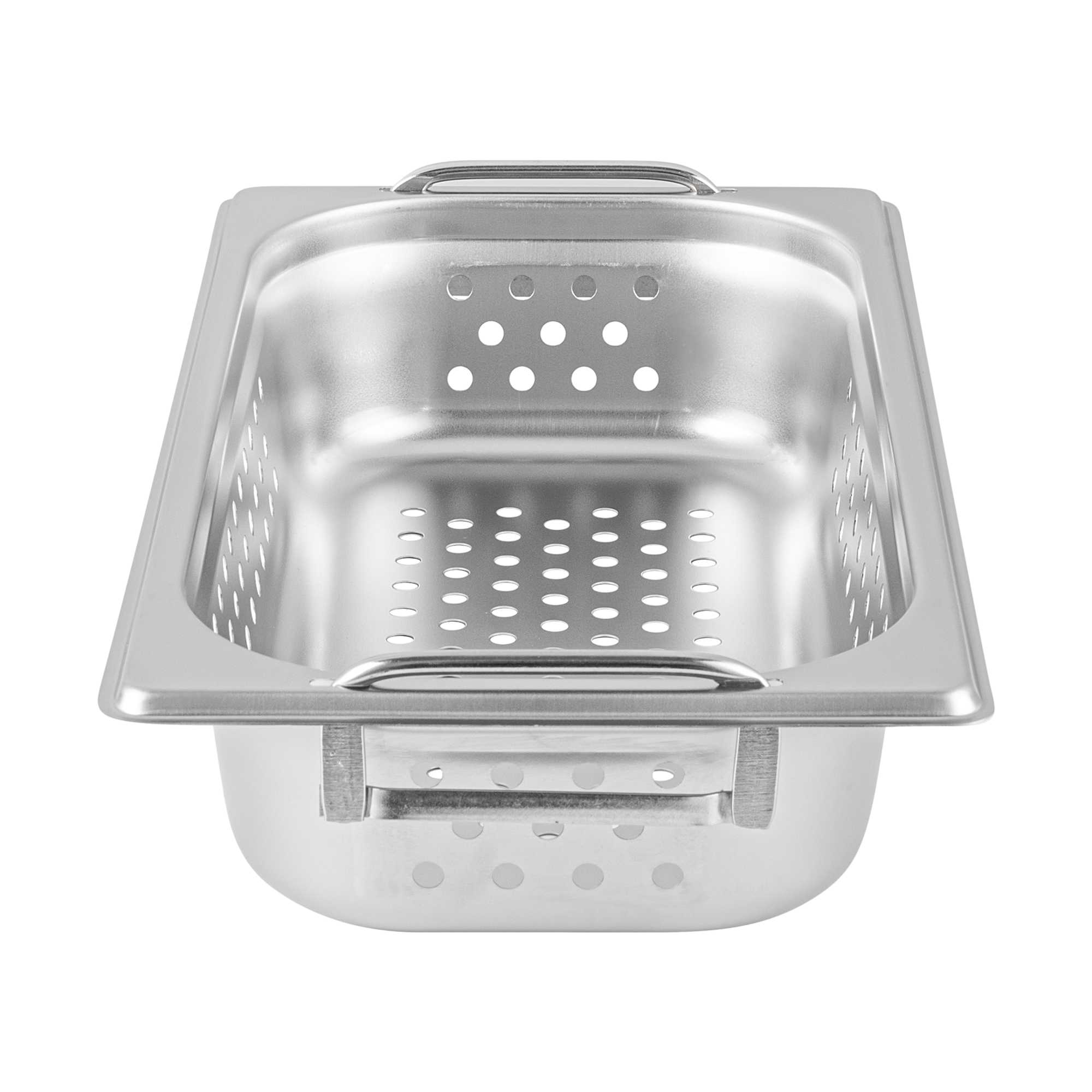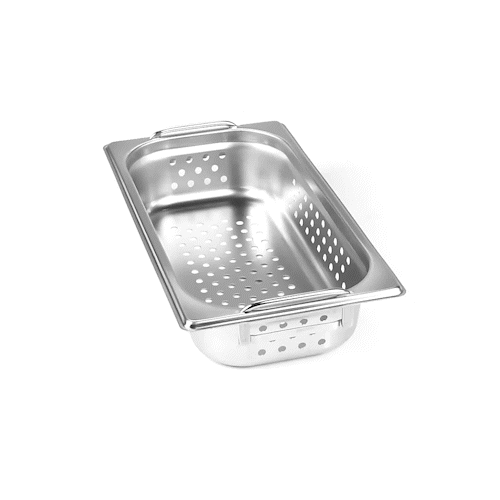 Boost efficiency and streamline serving with our Met Lux 1/3 Size Anti-Jam Perforated Stainless Steel Steam Table Pans with Collapsible Handles. Designed with easy-to-grip retractable handles, these perforated hotel pans make it effortless to transport, steam, and drain trays of your prepared foods. Their reinforced corners expertly resist warping or cracking, while their impact-resistant stainless steel body ensures reliable and long-term commercial use. These buffet steam table pans are also equipped with an innovative anti-jamming design to prevent pans from sticking together and enable hassle-free storage. These 1/3 steam table pans measure 2.5 inches in depth and can contain medium-sized portions of steamed vegetables, cooked pasta, poached seafood, and more. Pair these perforated hotel pans with our spill-resistant travel lids (SKU: RWT0053) or our traditional stainless steel lids (SKU: RWT0047) to complete the look. Lids sold separately. Each order will contain one 12.8-inch L x 7-inch W x 2.5-inch H perforated steam table pan with handles.