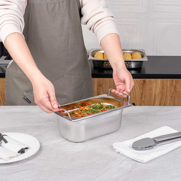 Upgrade your catered events and buffet service with our Met Lux 1/4 Size Anti-Jam Stainless Steel Steam Table Pans with Collapsible Handles. Designed with built-in retractable handles, these stainless steel food pans make it easy to transport and switch out your prepared foods. Their raised rim and flattened edges lock in steam and heat, while their easy-to-grip collapsible handles lessen the risk of burns and injury. Constructed from high-quality stainless steel, these impact-resistant steam table trays are built to withstand long-term commercial use. Their innovative anti-jam design prevents pans from sticking together and enables quick and hassle-free storage. Mix and match our available steam table pan sizes to create a customized solution for your establishment! Each of these oven-safe hotel pans measures 4 inches deep and can contain small to medium-sized portions of your delicious dishes. Pair these steam table pans with our spill-resistant travel lids (SKU: RWT0054) or our traditional stainless steel lids (SKU: RWT0048) to complete the look! Lids sold separately. Each order will contain one 10.4-inch L x 6.4-inch W x 4-inch H hotel pan with handles.