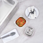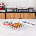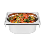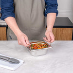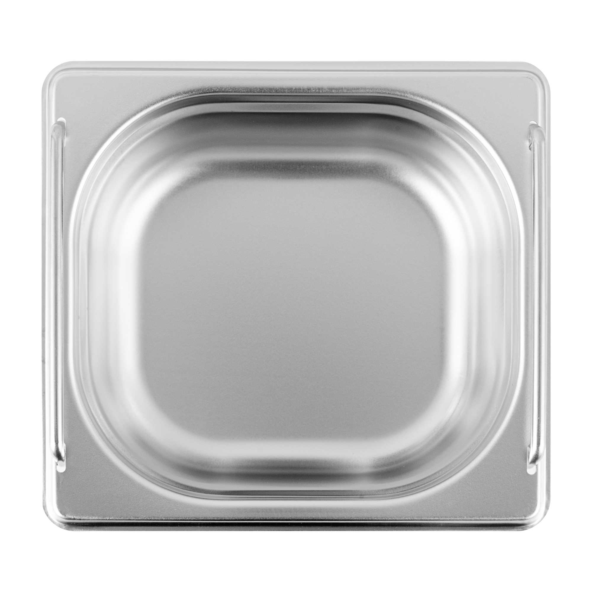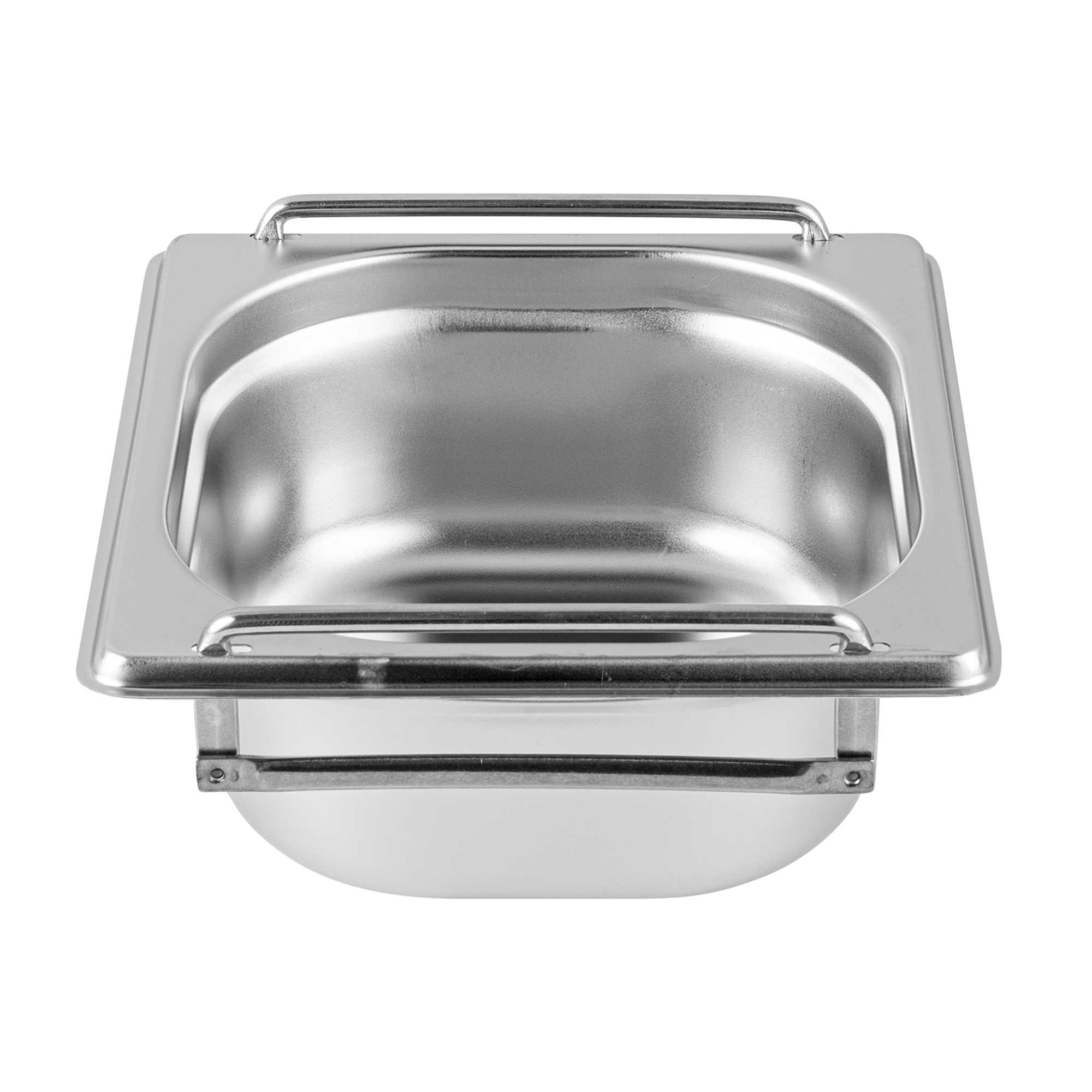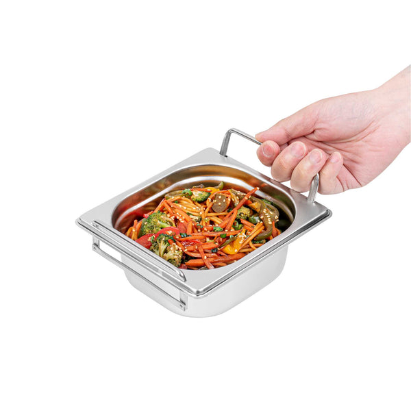 Improve your steam table setup with our Met Lux 1/6 Size Anti-Jam Stainless Steel Steam Table Pans with Collapsible Handles. Featuring built-in retractable handles, these oven-safe sixth pans ensure you can safely and easily transfer prepared foods to and from your steam table. Their anti-jam design enables efficient and hassle-free storage, while their impact-resistant stainless steel construction ensures reliable and long-term commercial use. These commercial steam table pans are also equipped with reinforced corners that are designed to resist warping or breakage. Measuring 2.5 inches deep, these catering steam pans are perfect for holding small portions of prepared foods for corporate functions, hotel buffet services, or other catered events. Pair these 1/6 hotel pans with our spill-resistant travel lids (SKU: RWT0055) or our traditional stainless steel lids (SKU: RWT0049) to complete the look. Lids sold separately. Each order will contain one 7-inch L x 6.4-inch W x 2.5-inch L steam table pan with handles.
