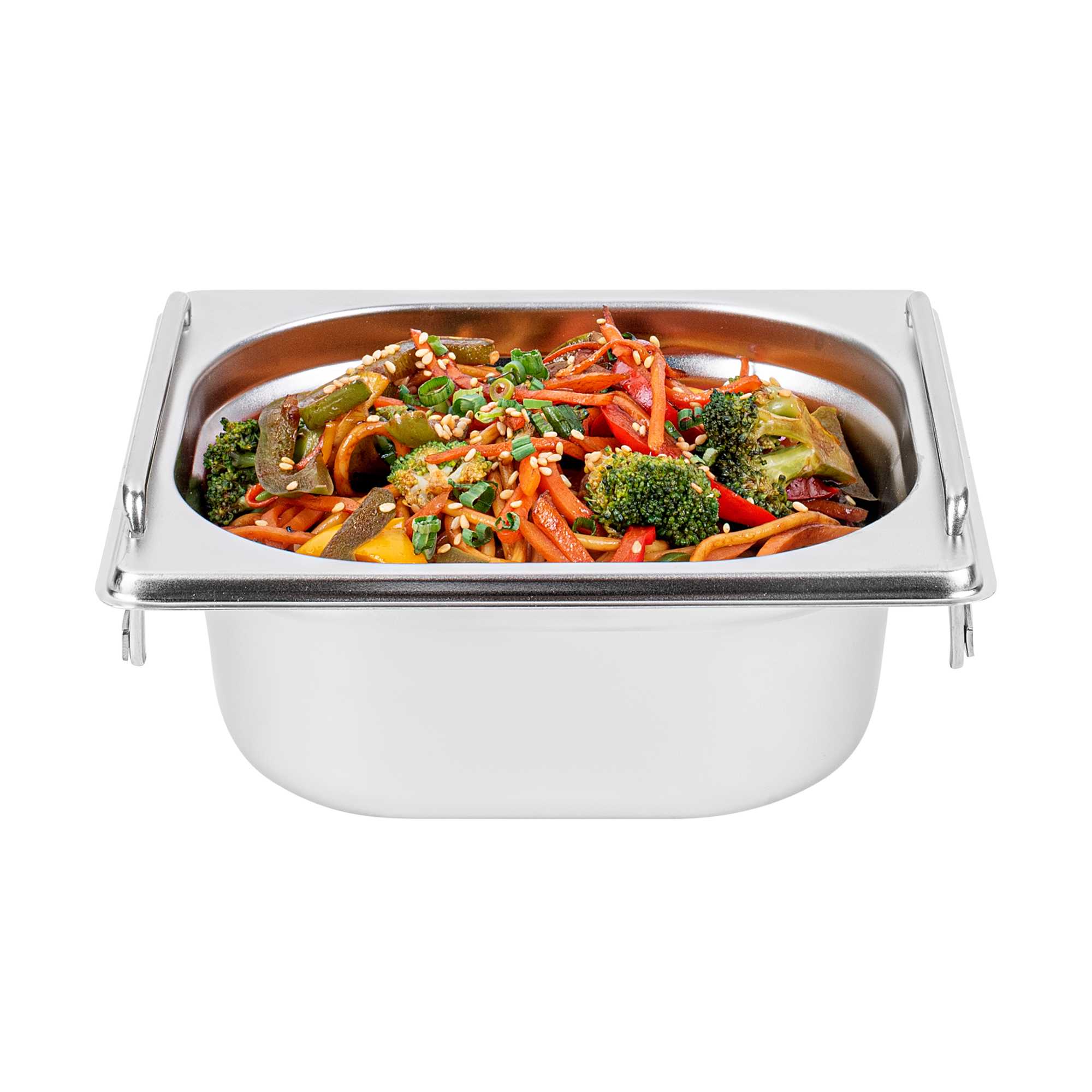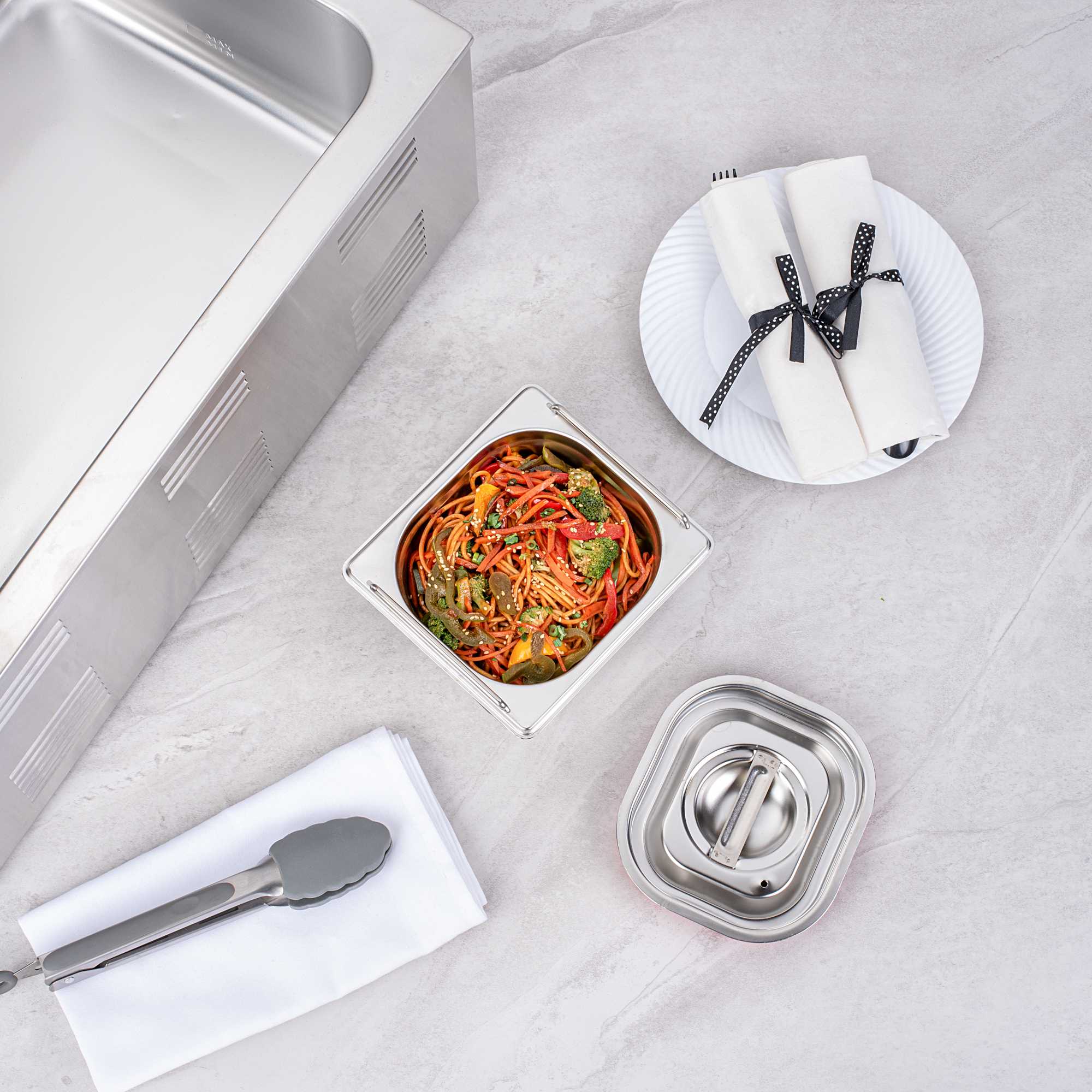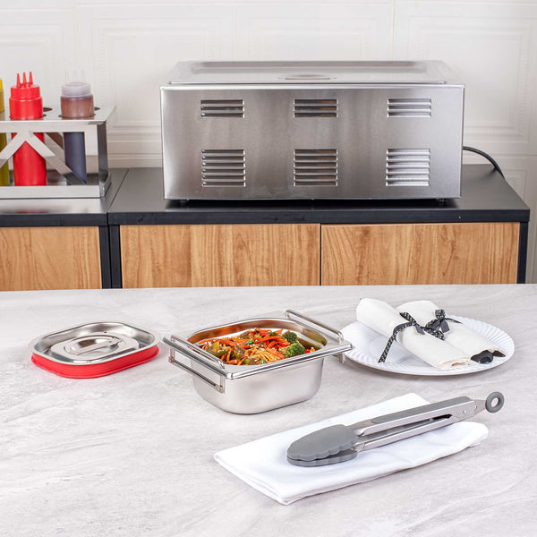 - Collapsible handles make it easy to carry and reload prepared foods in the steam table pans