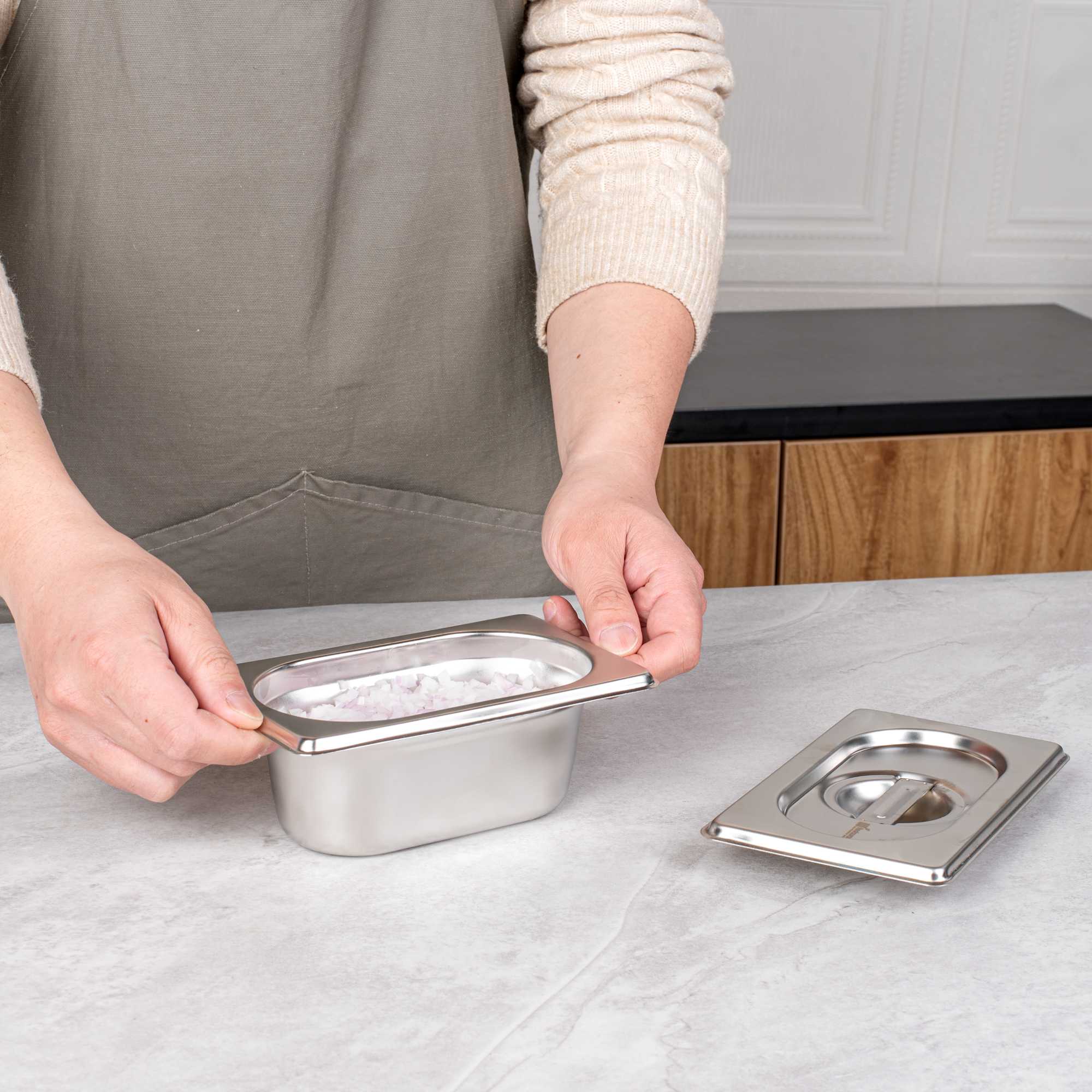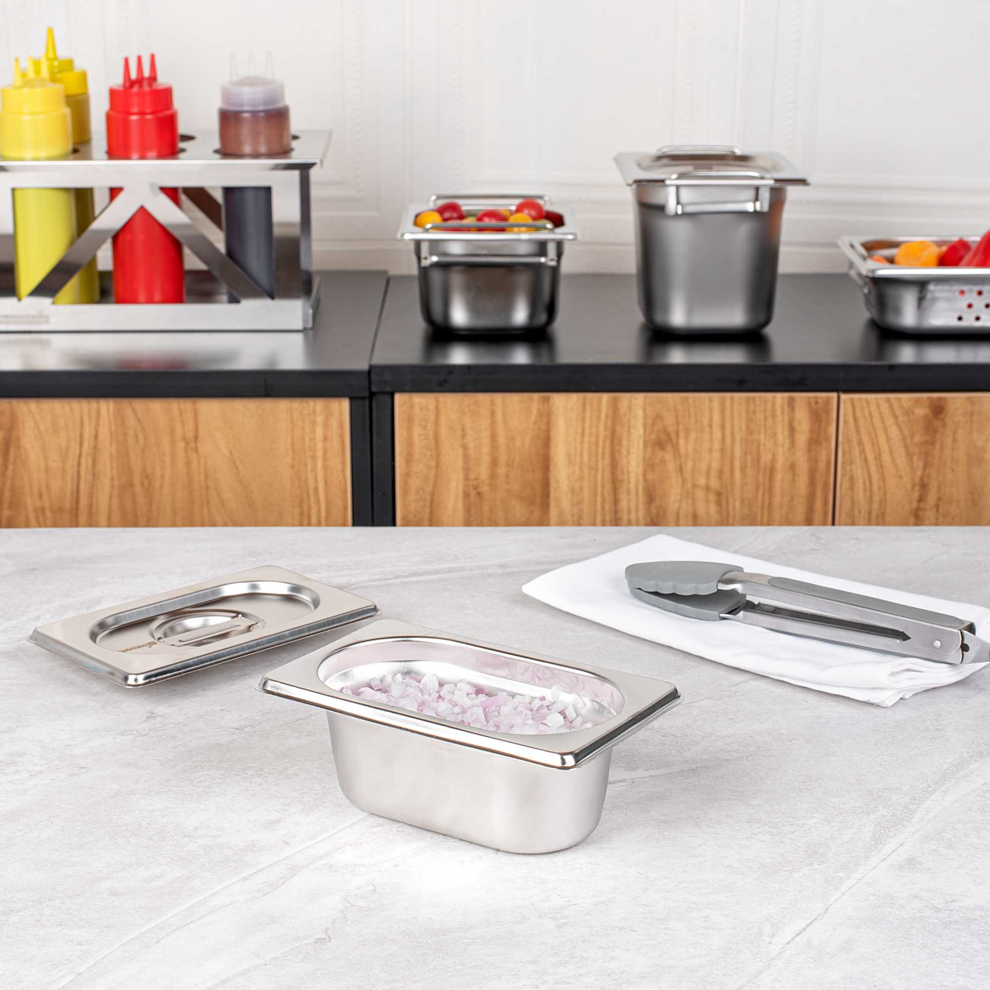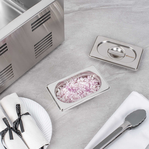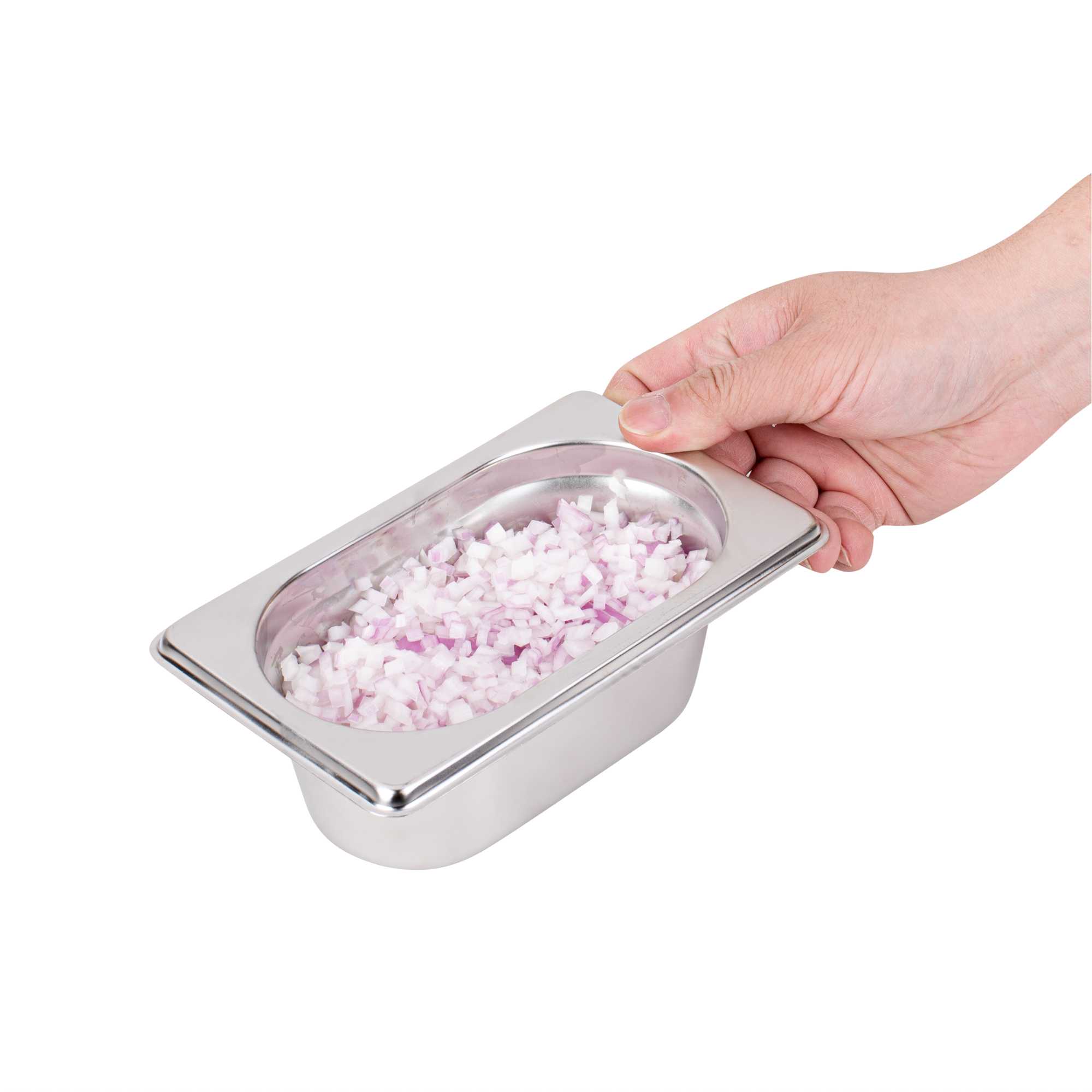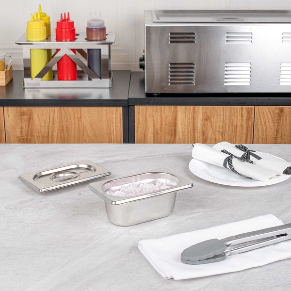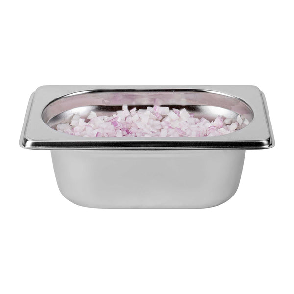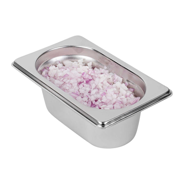 Boost efficiency and streamline service with our Met Lux 1/9 Size Anti-Jam Stainless Steel Steam Table Pans. Featuring a high-quality stainless steel construction, these hotel pans are suitable for use with both cold and hot applications. Their reinforced corners are built to resist warping and breakage, while their impact-resistant stainless steel construction ensures reliable and long-term commercial use. Featuring a unique anti-jamming design, these commercial steam table pans enable easy stacking and hassle-free storage. These 1/9 hotel pans are 2.5 inches deep and perfect for storing or warming small portions of sauces, side dishes, desserts, and more. Pair these stainless steel steam table pans with lids (SKU: RWT0050) to complete the look! Lids sold separately. Each order will contain one 7-inch L x 4.3-inch W x 2.5-inch H hotel pan.