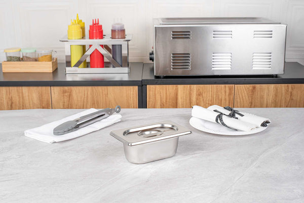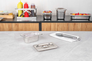 Use these Met Lux Stainless Steel Steam Table Pan Lids to lock in heat and keep your prepared foods enjoyably warm! Made from high quality stainless steel, these steam table pan lids are built to be long-lasting, scratch-resistant, and dent-resistant. Ideal for use by busy restaurants and catering companies, these steam table pan covers keep foods fresh, tasty, and protected. These steam table lids are designed with an easy-to-grab center handle to keep your prepared foods easily accessible. Use these 1/9 size steam table lids with any 1/9 size steam table pan. Each box contains 1 Met Lux 1/9 Size Steam Table Pan Lid.