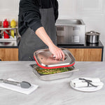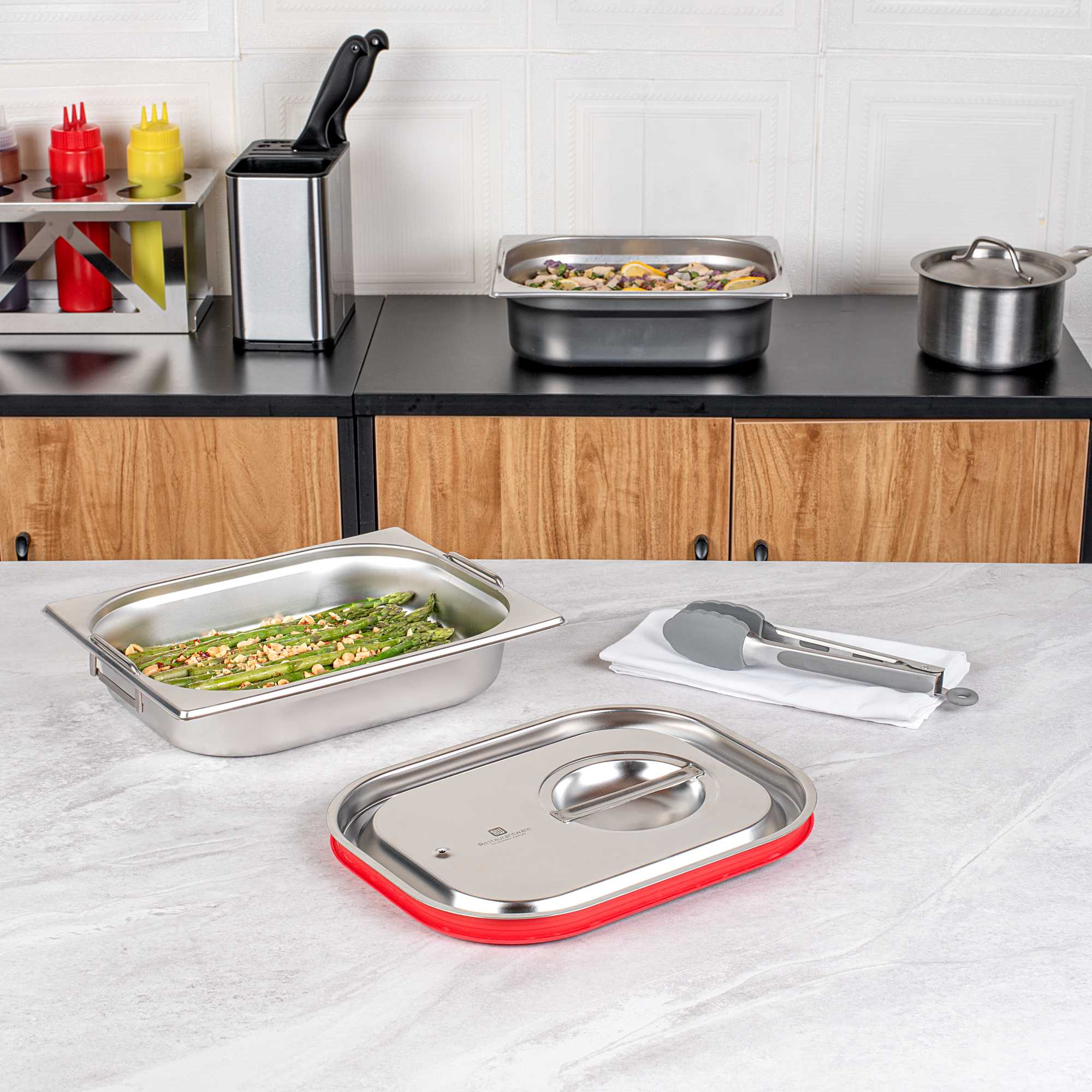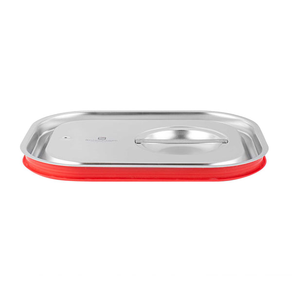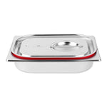 Keep trays of your prepared foods secure and protected on the go with our Met Lux 1/2 Size Steam Table Pan Travel Lid. Designed with a spill-resistant silicone seal, this stainless steel steam table pan lid makes it effortless to transport your dishes to off-site locations. Its reinforced edges lock in heat to keep your prepared food warm, while its large easy-to-grip handle provides safe and mess-free access inside. Pair this 12.8 x 10-inch impact-resistant commercial steam table pan lid with our coordinating half size steam table pans (SKU: RWT0031) for quick and easy service at banquets, hotel buffet services, and other catered events. Sold in a 1 count box.