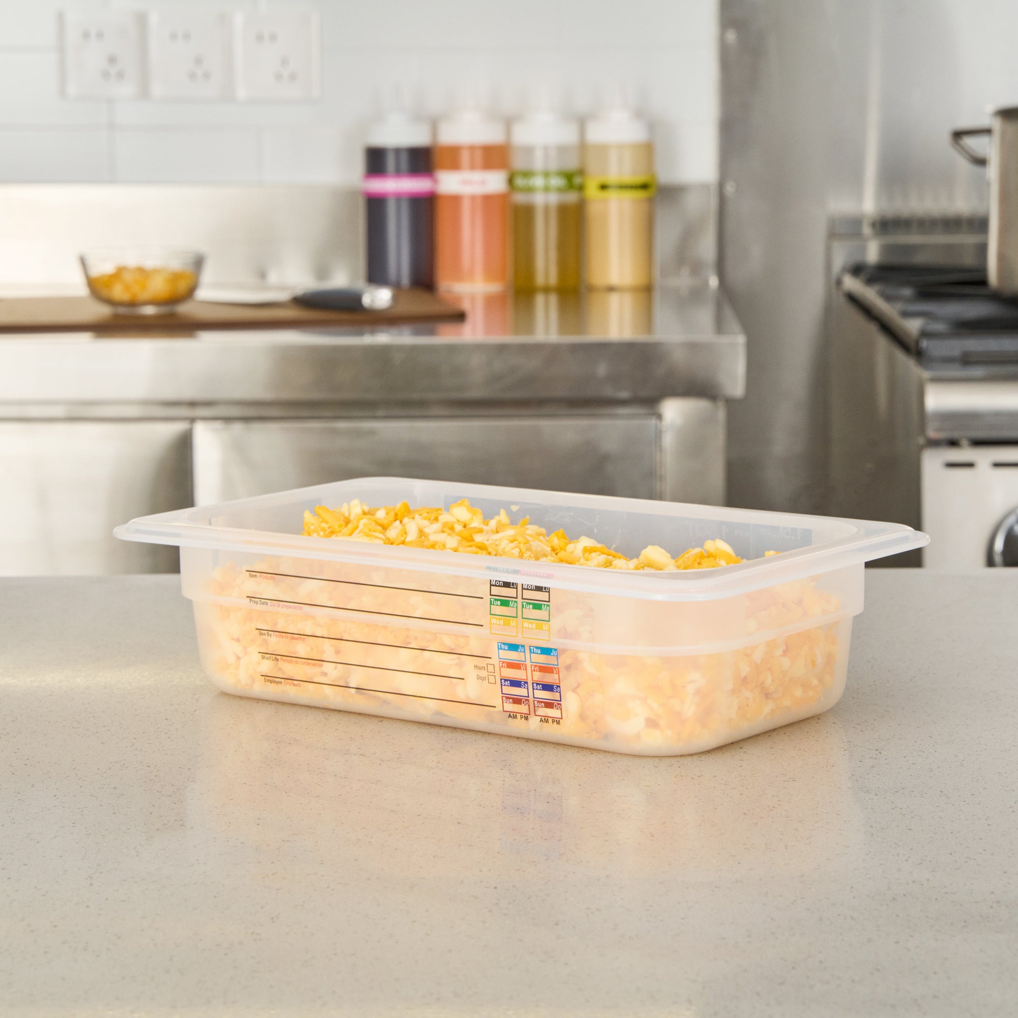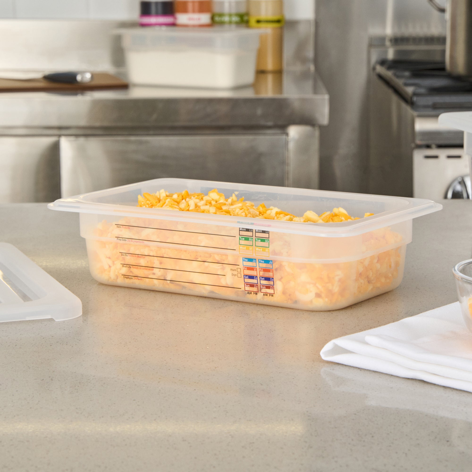 Optimize your kitchen's storage efficiency with versatile solutions. The Met Lux Built-In Label Food Storage Container offers a practical white plastic design that measures 10.3 inches in length, making it a reliable choice for any food storage needs. This food storage container features a built-in label that reduces costs with reusable markings, allowing staff to easily note important details like the food type and use-by date. Its shape maximizes storage space by up to 25%, providing an edge over round containers and making it an ideal plastic container for space-constrained kitchens. With temperature resistance from -40 to 203 degrees Fahrenheit, it supports versatile storage of both cold and hot items. Dishwasher safe and stackable, this stackable food container streamlines kitchen organization and cleaning processes. Elevate your foodservice operations by integrating this efficient solution. Each order includes 10 Met Lux Built-In Label Food Storage Containers.