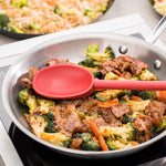 - Wide scoop stirs through creamy sauces and thick soups easily
