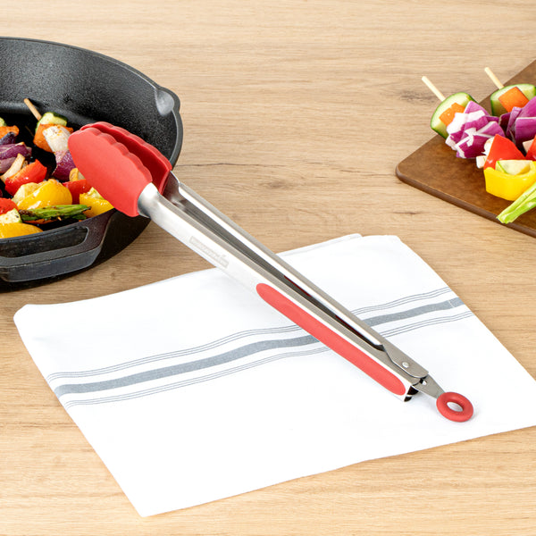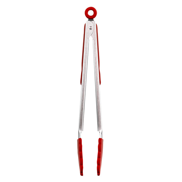 Flip food in pans without causing harm to the nonstick coating with our Met Lux Red Stainless Steel Kitchen Tong. The stainless steel body of this metal food tong ensures durability and resistance to rust for long-lasting performance. Designed with a gentle silicone head, this professional chef tong avoids scratching or damaging the non-stick coating of your cookware. The specially scalloped edges of this 12-inch tong provide an enhanced grip to keep food secure, preventing any slips or slides. Capable of withstanding temperatures up to 484F, this kitchen tweezers maintain its shape and integrity even during high-temperature cooking. The rubber handle of this plating tweezers is slip-resistant and features a convenient thumb rest for a comfortable grip and improved control. Efficiently store this kitchen forceps while saving space with the user-friendly easy-pull locking mechanism. Cleaning and maintaining this cooking forceps is easy, as it has a dishwasher-safe design. The stylish red finish of this locking tong enables easy identification to prevent cross-contamination. Measuring 12 inches in length, this versatile stainless steel tong serves a variety of cooking purposes. Shipped in a 1 count box.