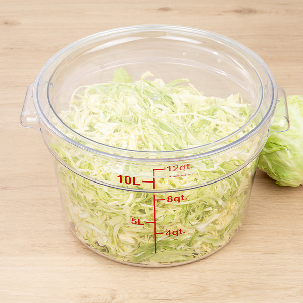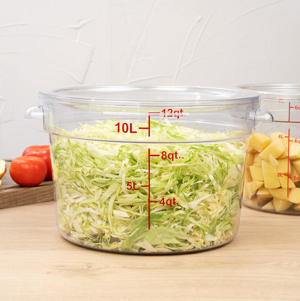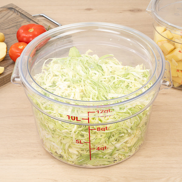 Securely store prepared foods using our Met Lux Round Clear Plastic Food Storage Container Lid. This container lid includes date indicators so employees can quickly jot down best-if-used-by dates on stored produce. Made to pair perfectly with our 12-,18-, and 22-quart food storage containers (SKU: RWT0850-1, RWT0851-1, RWT0852-1), this clear lid for food containers is ideal for storing large amounts of ingredients in your foodservice establishment. Made with premium plastic, this disposable container with lid is long-lasting and break-resistant to resist daily use in your commercial kitchen. This container lid is freezer-safe and allows you to easily store all kinds of hot and cold foods. To maintain its clear finish, this clear lid for food containers is scratch-resistant. For quick cleanup after use, this food container with lid is conveniently dishwasher-safe. This clear lid for food containers measures 12.5 inches in diameter by 0.75 inches tall. Shipped in a 1 count box. Containers sold separately.