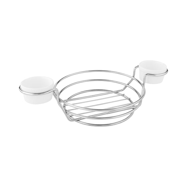 Double the sauce portions on your servings of chips with our Met Lux Round Silver Stainless Steel Duetto Appetizer and Chip Basket. Equipped with 2 dipping sauce holders and 2 white ramekins, this snack basket can serve mustard and ketchup along with your fries or chicken tenders. Its basket design securely contains your fare to avoid messes and provides steady handling during transport. Constructed from stainless steel, this food tray is reusable and corrosion-resistant to maintain its premium appearance. This french fry basket can be lined with food-safe paper wraps to make clean up quick and easy at your restaurant or catered event. This appetizer basket measures 10.25 inches length by 7 inches in width by 3 inches in height and each ramekin holds up to 1 ounce of sauce. Sold in a 1 count box.