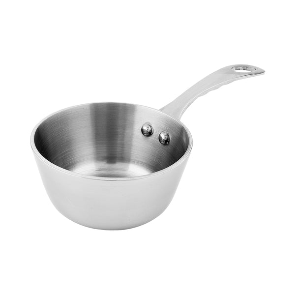 Prepare and serve butter with our Met Lux Round Silver Stainless Steel Mini Sauce Pan. This small sauce pan expertly contains salad dressing or salsa for dipping. Designed with a silver finish, this mini sauce pan elegantly enhances your sauce presentations. Made from premium stainless steel, this metal sauce pan expertly retains heat to evenly cook your tasty dips. This metal sauce pan is oven-safe and freezer-safe to keep your condiments at your preferred temperature. With a hanging hole on the handle, this stainless sauce pan can be conveniently hung on a hook for easy and efficient storage. This dipping cup is corrosion-resistant and dishwasher-safe to speed up cleanup after your service hours. Measuring 7 inches long by 3.5 inches wide by 2 inches tall, this sauce pan is sold in a 1 count box.