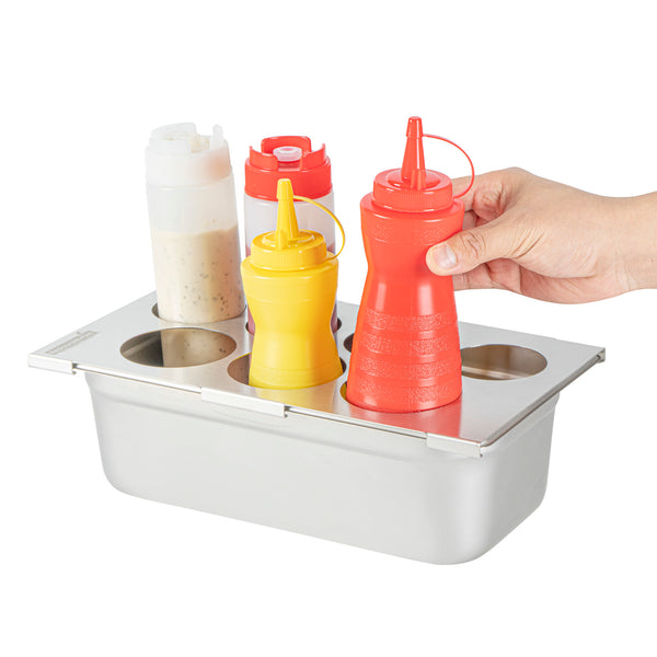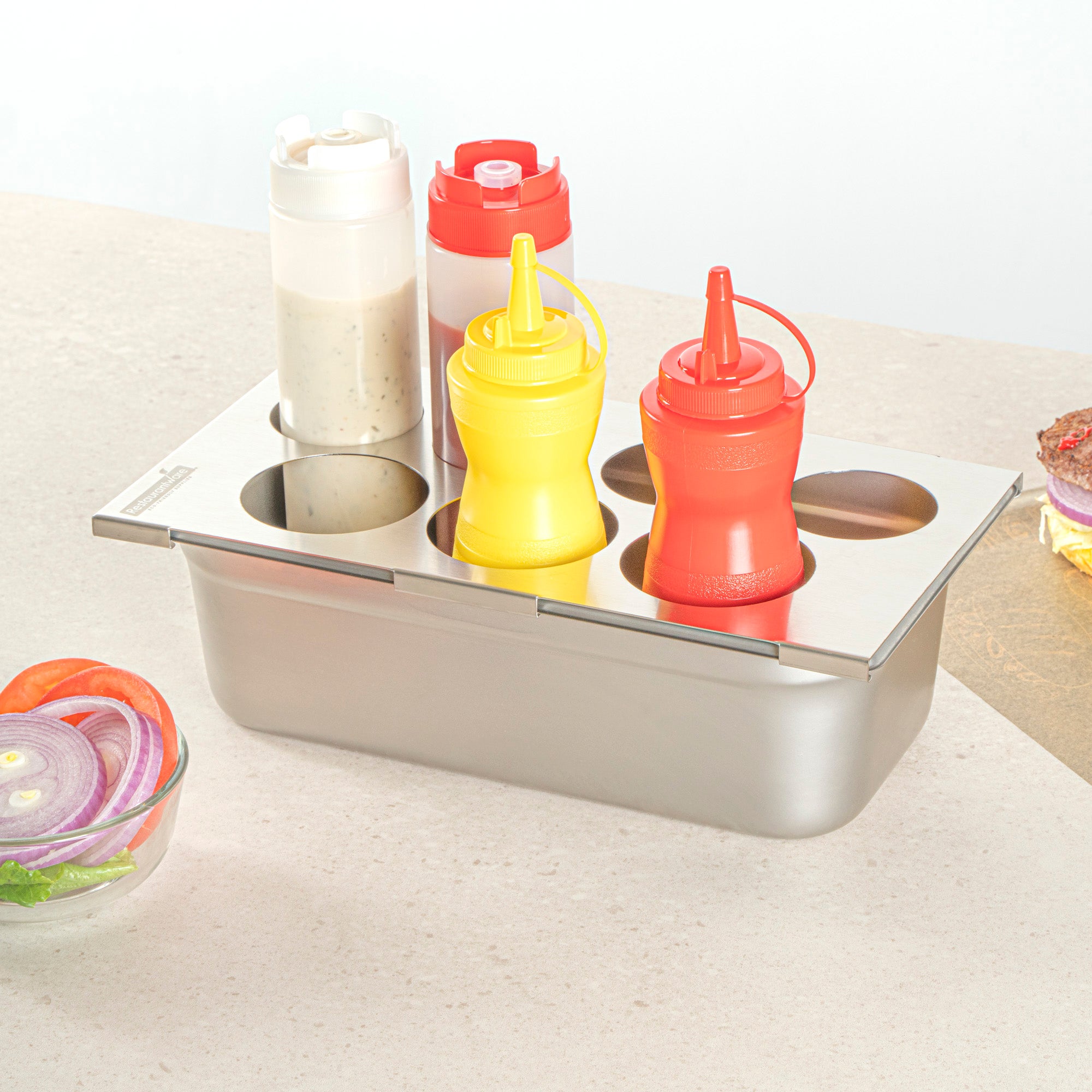 Enhance your condiment station with efficient organization. The Met Lux Stainless Steel Squeeze Bottle Holder Top offers a robust solution with its stainless steel construction, ensuring durability and resistance to corrosion in bustling kitchen environments. This squeeze bottle holder features a seven-hole design, accommodating multiple bottles to keep condiments neatly organized and easily accessible, making it a reliable condiment bottle organizer. Its dishwasher-friendly design simplifies cleaning processes, promoting hygiene and efficiency in fast-paced settings. Measuring 12 3/4 inches by 7 inches, this stainless steel condiment organizer fits standard 1/3 size pans, allowing seamless integration into existing prep stations and maximizing bottle storage in limited space. Elevate your kitchen's efficiency and maintain a tidy workspace with this essential kitchen tool. Sold in a 1 count box.