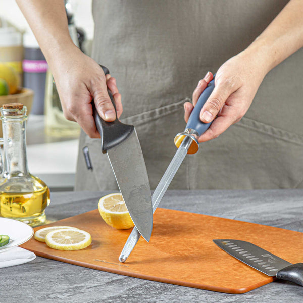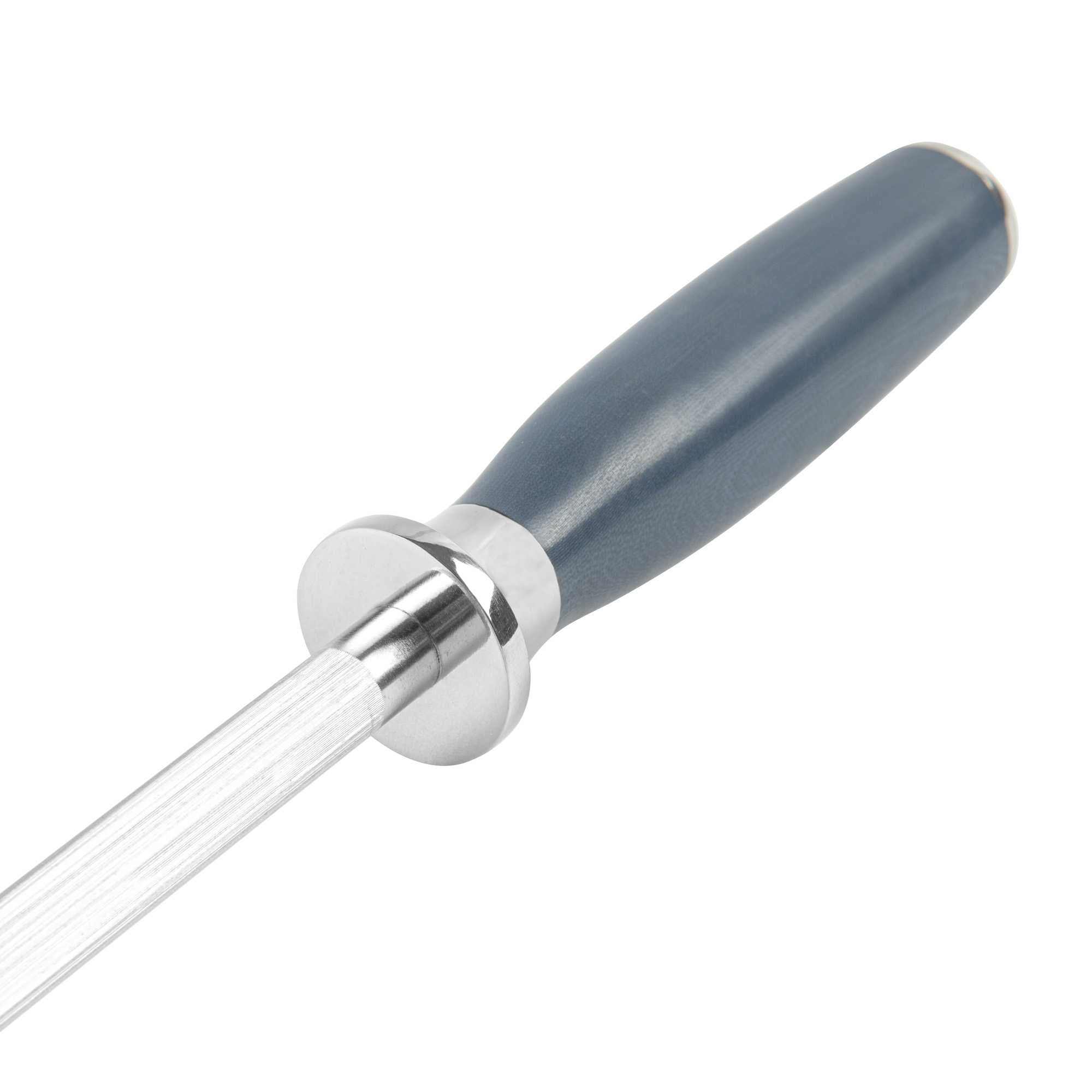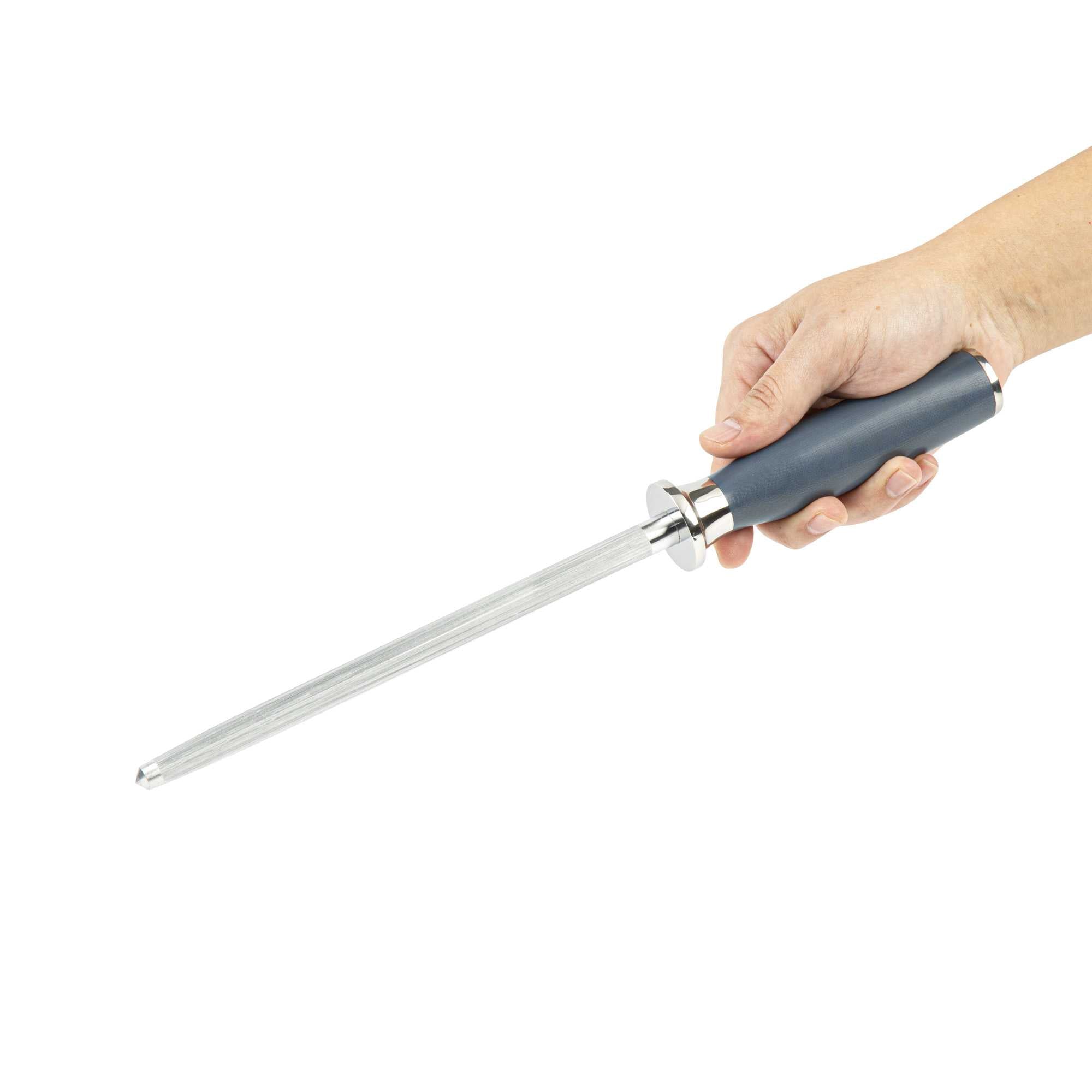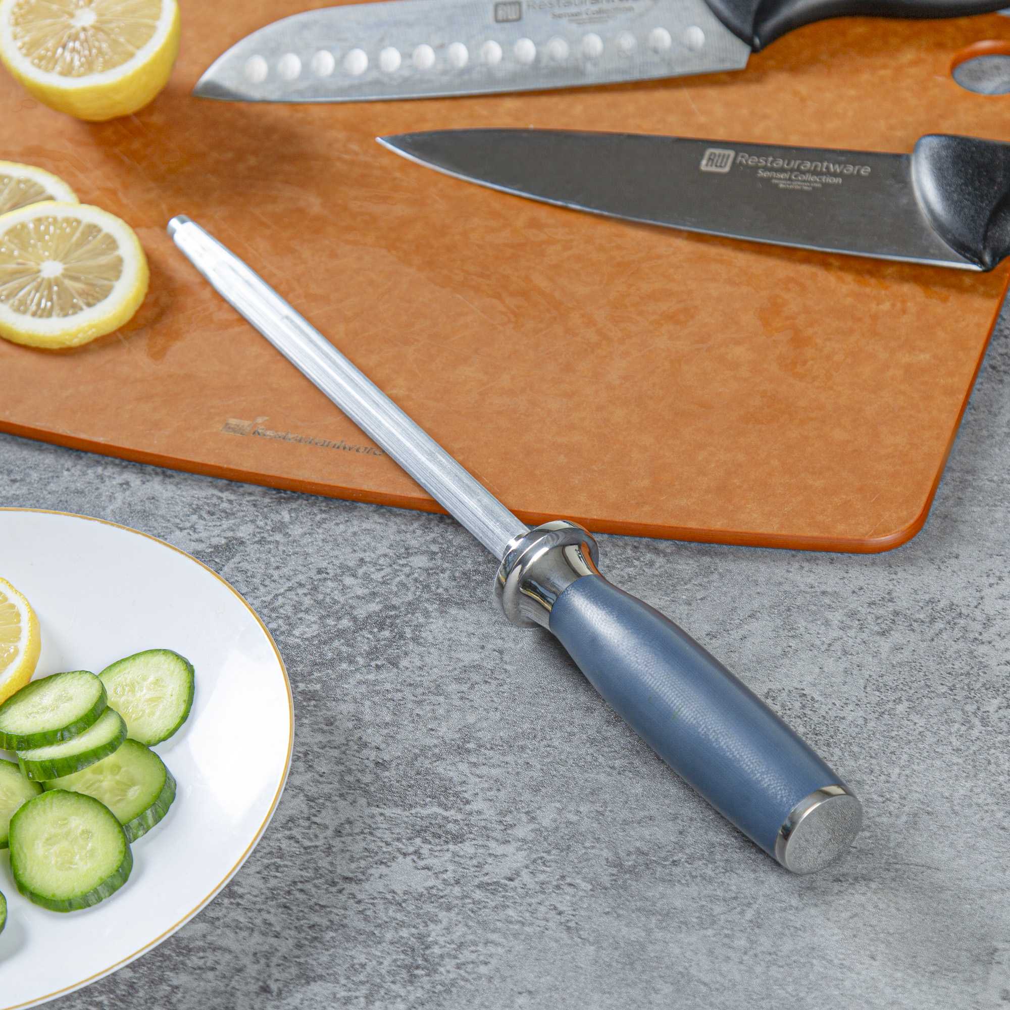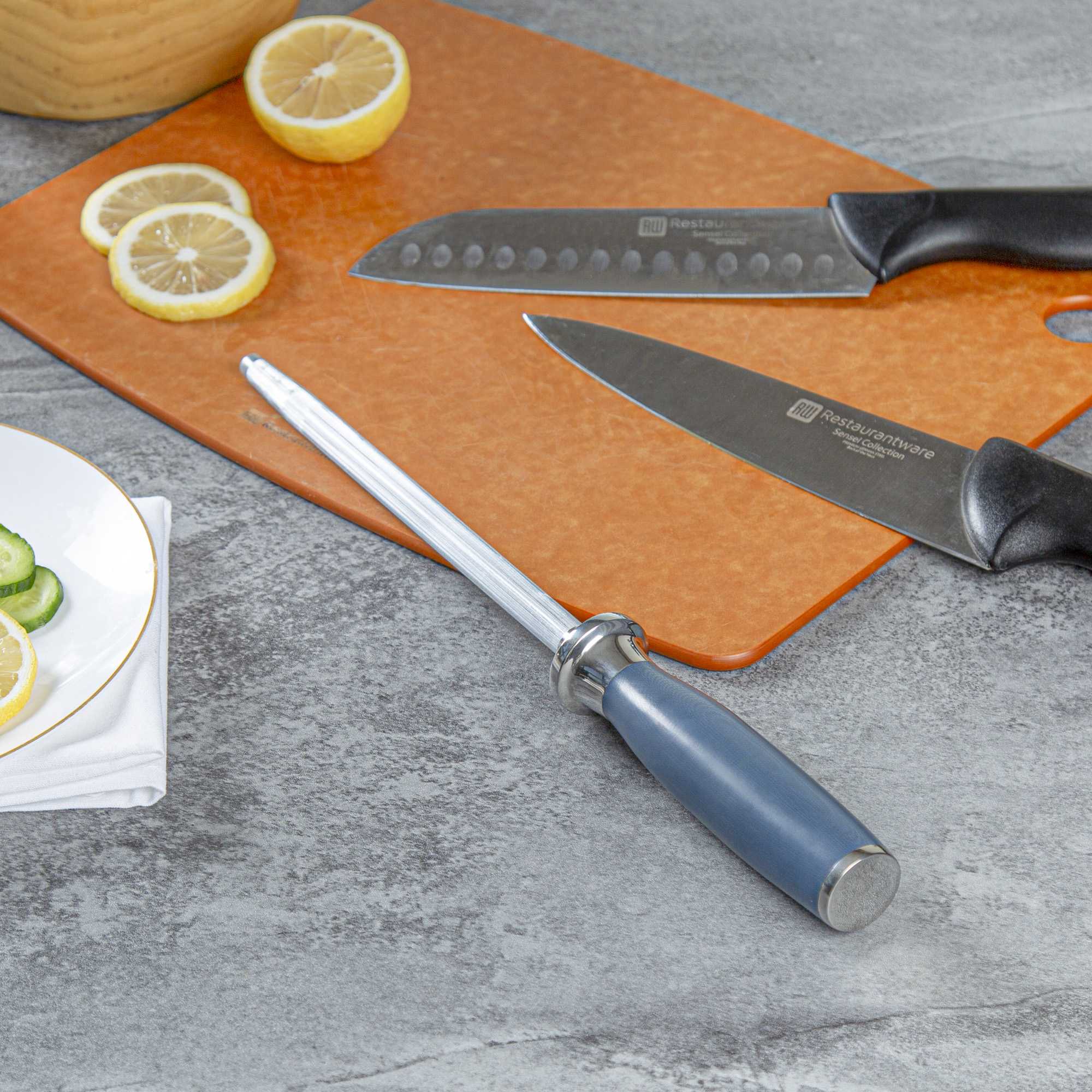 Extend the life of your kitchen knives with this Met Lux Knife Sharpening and Honing Steel. Constructed from high-carbon steel with a chromium finish, this sharpening rod makes it quick and easy to bring a sharp edge to your kitchen knives. Use this high-carbon sharpening steel regularly to remove knife build-up and create razor-sharp cutting edges. Built to withstand long-term commercial use, this sharpening steel is perfect for restaurants, hotels, catering companies, food trucks, and other foodservice establishments. Each of these knife sharpening sticks is equipped with an ergonomic G10 handle that is moisture-resistant to provide a secure and slip-resistant grip. This knife honing steel has an 8-inch blade and measures 13.1 inches in total length. Shipped in a 1 count box.