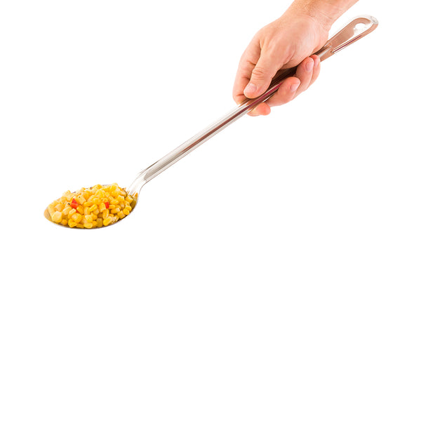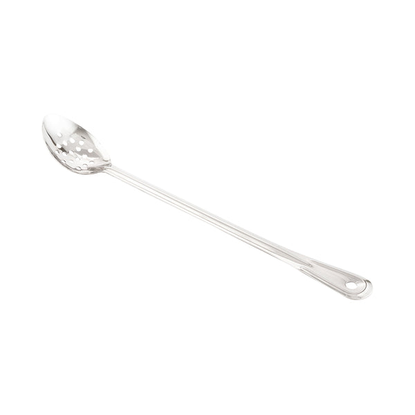 Stir and serve sauces, side dishes, entrees, and more with this Met Lux Professional Perforated Serving Spoon. Equipped with a conveniently extended handle, this large serving spoon measures 18 inches long and is suitable for use with any stockpot or serving tray. Its deeply grooved handle promotes efficient and comfortable usage, while its durable stainless steel construction ensures reliable and long-term commercial use. Designed with a rounded, perforated bowl, these stainless steel serving spoons are great for stirring sauces, straining vegetables, and serving other messy foods. In addition, each of these basting spoons features a built-in hole for quick and easy hanging storage. Featuring a polished stainless steel finish, these catering spoons are excellent for use in the front or back of house. Shipped in a 1 count box.