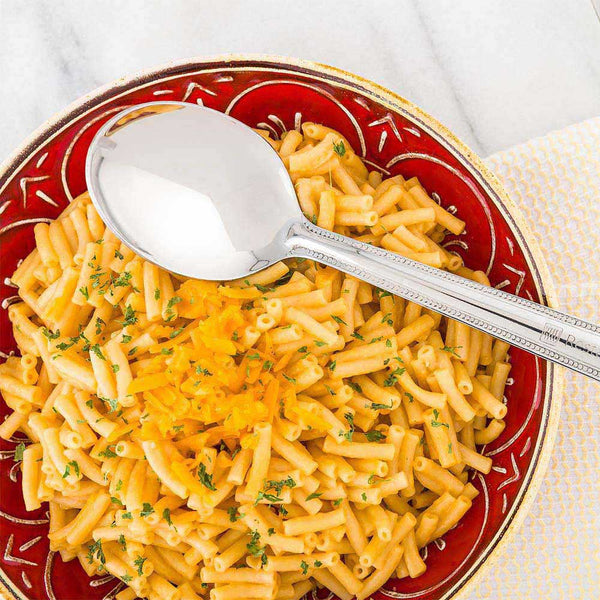 Instantly upgrade the look of buffets and catered events with this Met Lux Solid Buffet Serving Spoon. Designed with a contemporary detailed handle and high-shine polished finish, this stainless steel serving spoon is a must-have for any upscale restaurant, hotel or catering company. Its compact length enables compatibility with most buffet serving trays and steam table pans, and its high-quality stainless steel construction ensures long-term and reliable commercial use. Measuring 9 inches long, these catering spoons are suitable for stirring and serving sauces, appetizers, salads, side dishes, entrees, desserts, and more! Shipped in a 1 count box.