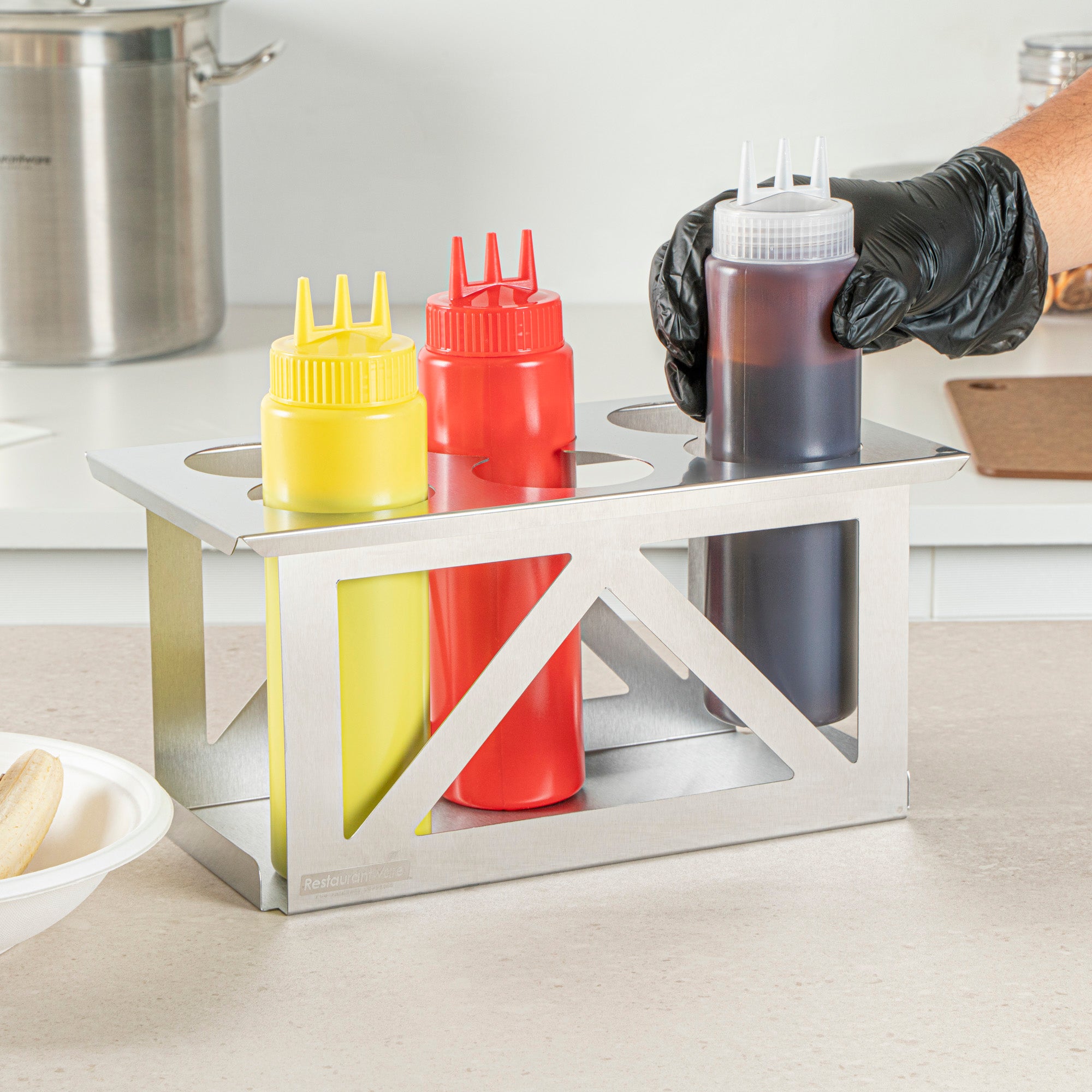 Enhance condiment accessibility with a squeeze bottle organizer that fits seamlessly into your kitchen. The Met Lux Stainless Steel Squeeze Bottle Organizer is expertly crafted from durable stainless steel, ensuring long-lasting use and resistance to corrosion, making it ideal for busy kitchen environments. Its six-hole design, compatible with 1/3 size openings, efficiently organizes multiple squeeze bottles, optimizing condiment accessibility and workspace organization. The compact dimensions of 12 3/4 inches in length, 7 inches in width, and 6 1/4 inches in height allow it to fit seamlessly into standard kitchen setups without occupying excessive counter space. The dishwasher-friendly design simplifies cleanup and maintenance, making it an indispensable tool for maintaining hygiene standards in food preparation areas. This six hole bottle holder is perfect for streamlining condiment stations in commercial kitchens, enhancing operational efficiency. Sold in a 1 count box.