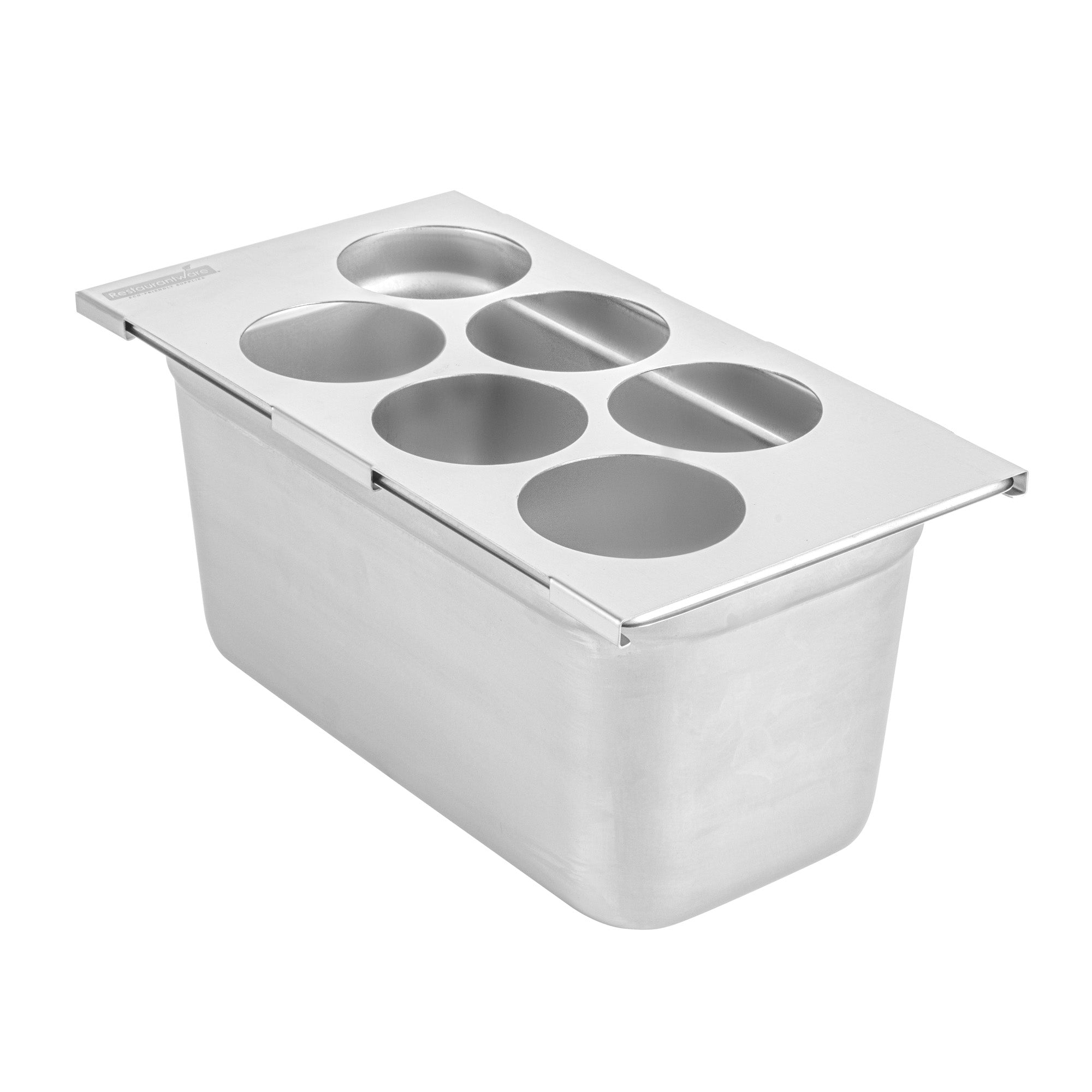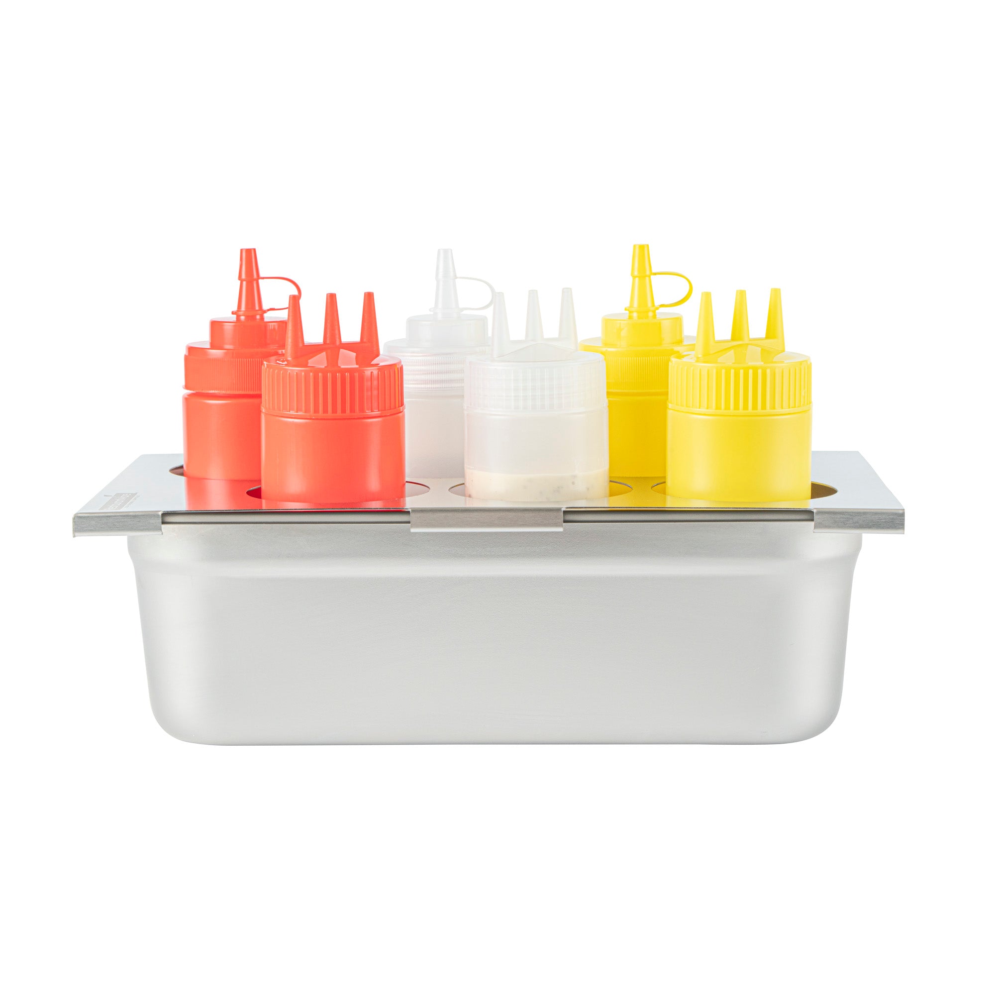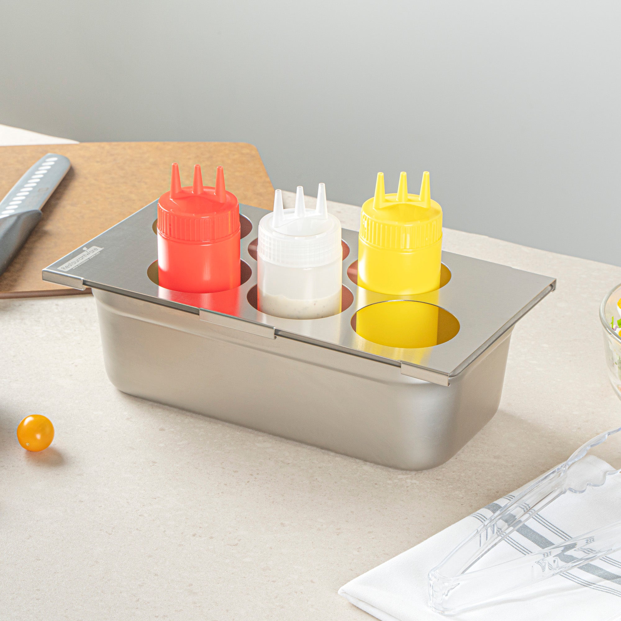 Enhance kitchen efficiency with a durable squeeze bottle holder top. The Met Lux Stainless Steel Squeeze Bottle Holder Top is designed to keep bottles organized for efficient prep station workflow, accommodating up to six squeeze bottles within its 12.8 inches by 7.1 inches frame. Its stainless steel construction offers exceptional durability and resistance to corrosion, making it ideal for high-pressure restaurant environments. As a versatile condiment organizer, it fits seamlessly into 1/3 size pans, allowing for easy integration into existing setups. The six-hole design supports sauces, dressings, and oils, providing chefs with quick access to essential condiments, thereby reducing prep time. Additionally, this dishwasher-safe bottle holder is easy to clean, ensuring quick and simple maintenance to comply with health standards. Streamline your culinary operations with this reliable solution for condiment organization. Sold in a 1 count box.
