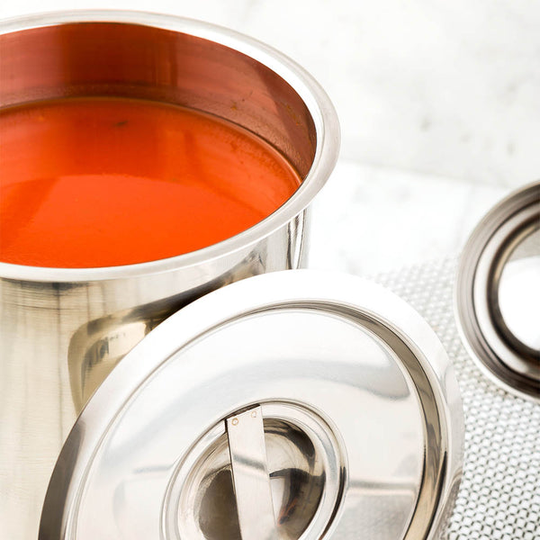 Save your savory dishes with our Met Lux Bain Marie Cover for 4.25-quart pots. With a coordinating metal pot, this bain marie lid provides easy serving and storage all in the same container. Constructed from stainless steel, this durable pot cover securely locks in delicious dishes at your restaurant, buffet, catered event, and more. This metal pot lid is specially designed to accompany our 4.25 quart bain marie pot (SKU: RWT0178). Bain marie pot sold separately. Measuring 7.5 inches in diameter, this stainless steel pot lid ships in a 1 count box.