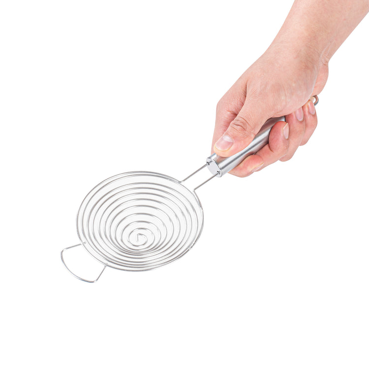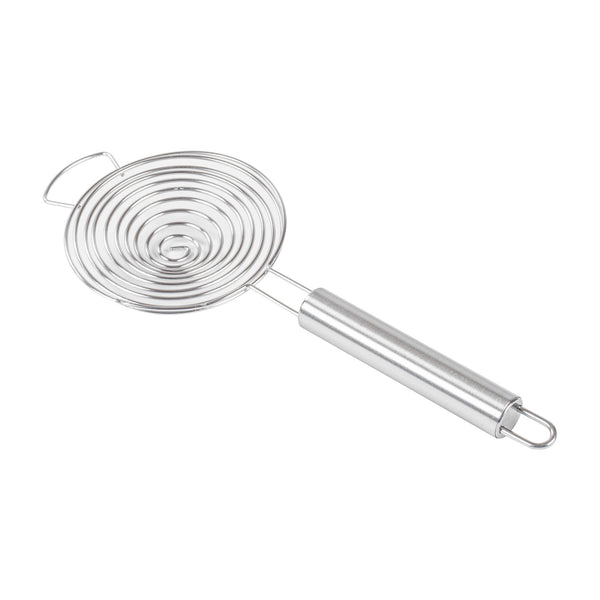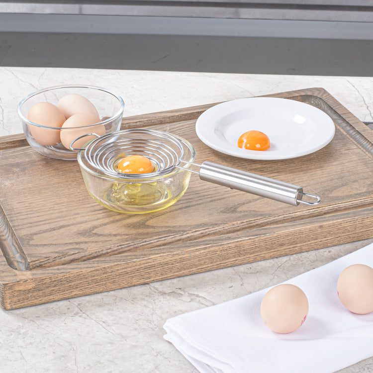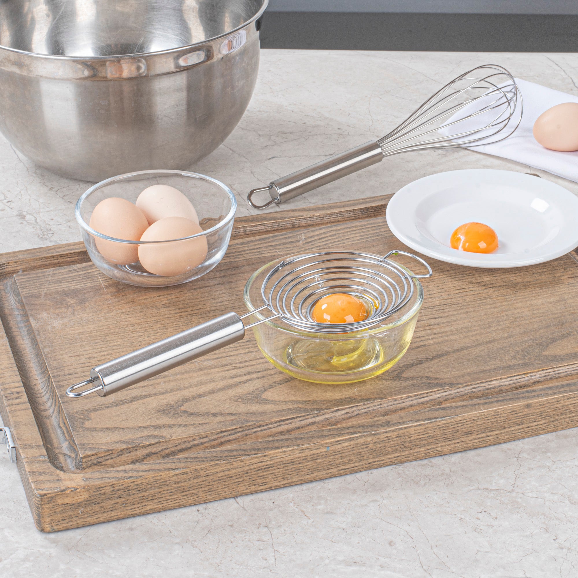 Seamlessly separate a dozen egg yolks from egg whites with our Met Lux Stainless Steel Egg Separator. With a spiral design, this egg sieve catches the yolk and allows the whites to fall through the spirals and into your bowl. The buckle of this yolk separator lays on to the rim of the bowl to ensure it doesn't slip and mix egg whites with the yolk. Designed with a handle, this egg yolk separator keeps hands free from touching ingredients while making your macarons or meringues. Equipped with a hanging hole at the end of the handle, this egg white filter provides easy storage at your bakery, restaurant, or coffee shop. Its silver finish effortlessly matches your existing commercial kitchen tools. Crafted from sturdy stainless steel, this egg divider is corrosion-resistant and dishwasher-safe to streamline your cleaning process. Measuring 10.25 inches long, this yolk remover is sold in a 1 count box.