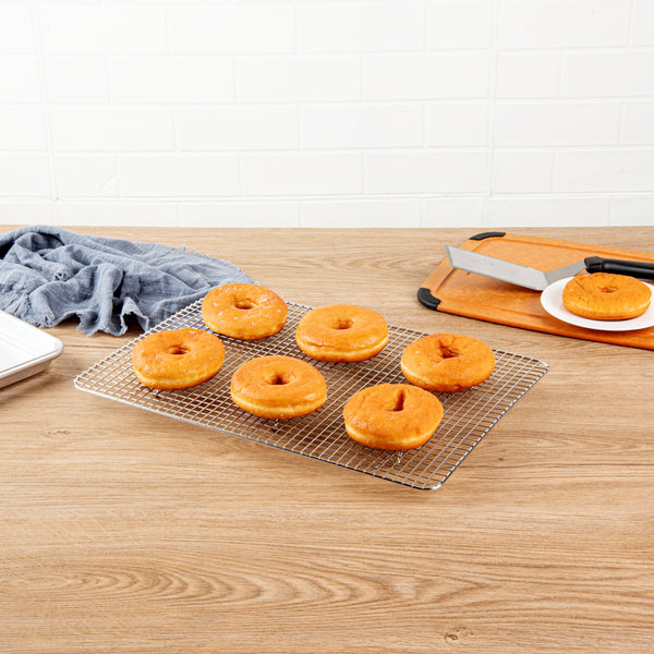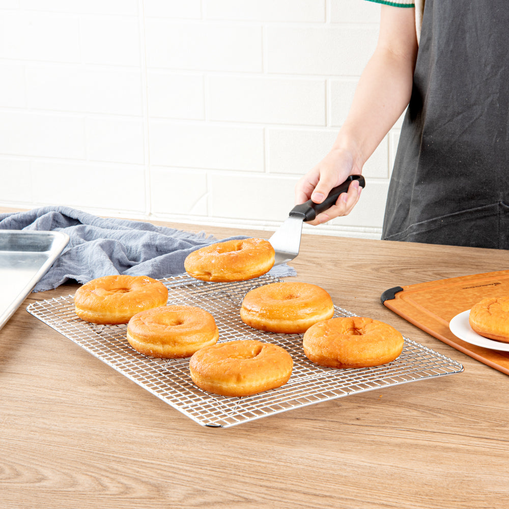 With perfectly spaced grid wires, these metal cooling racks ensure even air circulation for faster cooling after baking. The tight grids keep the baked goods in place without falling through.