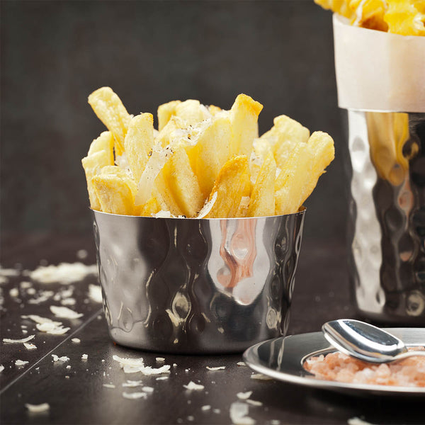 STAINLESS STEEL FRENCH FRY CUP - HAMMERED, MIRRORED FINISH
