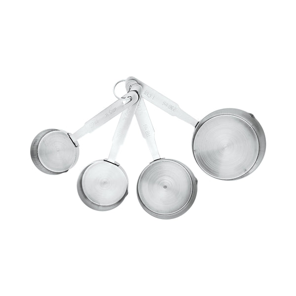 The Met Lux Measuring Cup Set from Restaurantware provides you with the convenience of not having to eyeball your ingredients anymore. This stainless steel measuring cup comes in four different sizes: one 1 cup, 1/2 cup, 1/3 cup, and 1/4 cup. You'll be able to identify these measurements based on the engraved labeling on the handle. Never worry about misplacing a metal measuring cup as they are bound together by a durable stainless steel metal ring. Each measuring cup is designed with a little spout made for pouring out liquid ingredients easier. This entire set measures at 7 inches long and 3.4 inches wide with a stainless steel finish. You will receive one stainless steel measuring cup set per order.