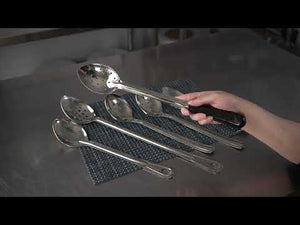 Efficiently strain and serve your vegetables, side dishes, salads, and more with these Met Lux Perforated Serving Spoons with Black Plastic Handles. Made from high-quality stainless steel, these perforated serving spoons are incredibly strong and durable. Their perforated design quickly separates solid foods from broths and sauces, while their long extended handles keep hands clean and dry. Designed with a grooved plastic handle, these stainless steel serving spoons ensure a secure and comfortable grip for quick and easy service. Provide these basting spoons alongside your buffet serving trays or steam table pans, or use them as a time-saving way to plate dishes in your restaurant. Each of these all-purpose kitchen serving utensils measures 13 inches long. Shipped in a 1 count box.