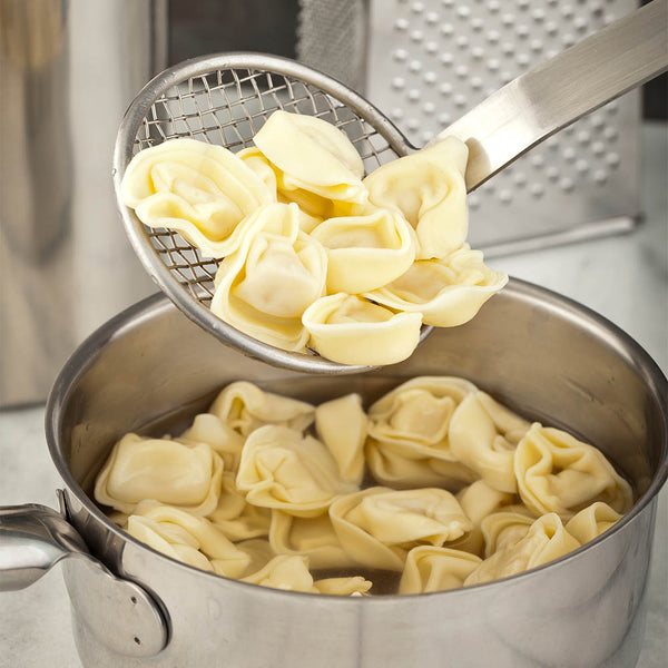 - Mesh scoop allows for quick removal of food items from boiling water or hot oil