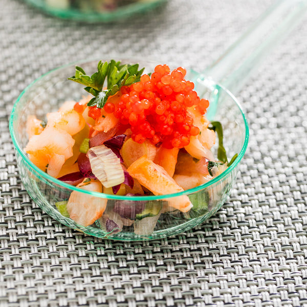 Enhance your bite-sized delicacies with our Mini Serve stylish 1-ounce Round Seagreen Plastic Mini Sauce Pans with Silver Plastic Mini Forks. Manufactured from top-notch heavy-duty plastic, these miniature saucepans are sturdy and attractive, enabling an impressive display of appetizers and other small servings. Boasting a tinted-seagreen finish, these disposable pans add a refreshing pop of color to any tablescape. These serving dishes have a 1-ounce capacity, making them ideal for individual portion servings. Drawing inspiration from classic sauce pan designs, these appetizer plates infuse your table setting with a streak of culinary sophistication. These party dishes feature a built-in handle for effortless handling. Teamed with the silver plastic forks, these sauce dishes captivate and create a pleasing dining visual for your guests. These plastic forks come with robust handles, which can handle sizeable bites of your dishes without losing their form. To promote convenient post-event cleanup, these plastic dishes and mini forks are conveniently disposable. These dessert dishes measure 3.25 inches in length by 2 inches in width by 0.5 inches in height and have a capacity of 1 ounce, while the tasting forks measure 4 inches in length. Each order includes 100 pans and 100 forks.