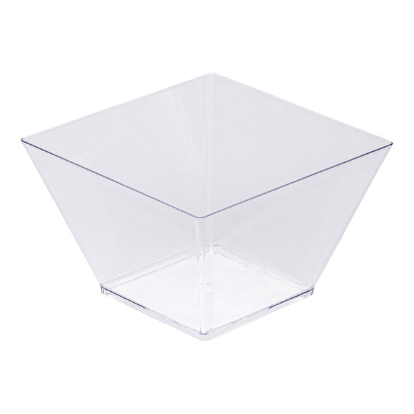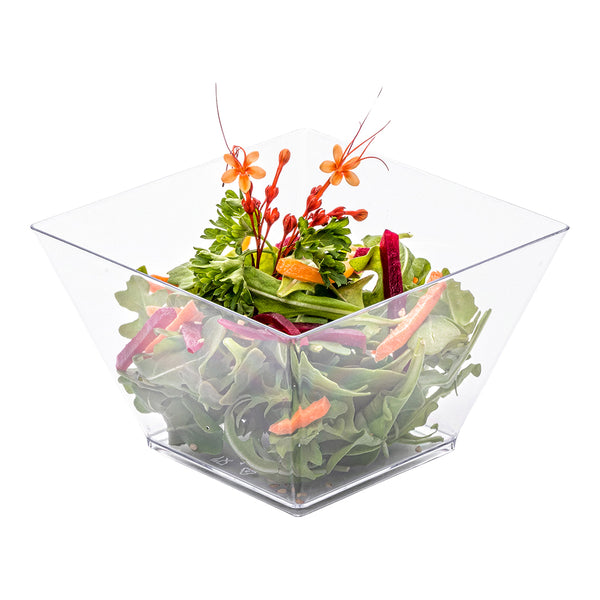 Turn your food presentation into an upscale event with our Mini Serve 16-ounce Square Clear Plastic Large Kova Bowls with Silver Plastic Mini Forks. Manufactured from high quality plastic, these square bowls and salad forks are conveniently disposable, perfect for an efficient cleanup. These 16-ounce bowls have a sleek square design and a clear finish to beautifully showcase vibrant salads, acai bowls or poke bowls while reducing environmental impact. With sturdy yet lightweight construction, these salad bowls provide an elegant and versatile solution for serving everything from appetizers to desserts. Paired with shiny silver plastic mini forks, these serving bowls create an elevated table setting that is perfect for any fast casual restaurant, cafe or catering event. These 4-inch forks have strong and sturdy handles are designed to stand up to hearty bites of any dish while their small size is ideal for accompanying personal sized portions. Measuring 4.25 inches long by 4.25 inches wide by 3 inches tall, these clear bowls have a capacity of 16 ounces, while the plastic forks measure 4 inches long. Each order includes 100 bowls and 100 forks.