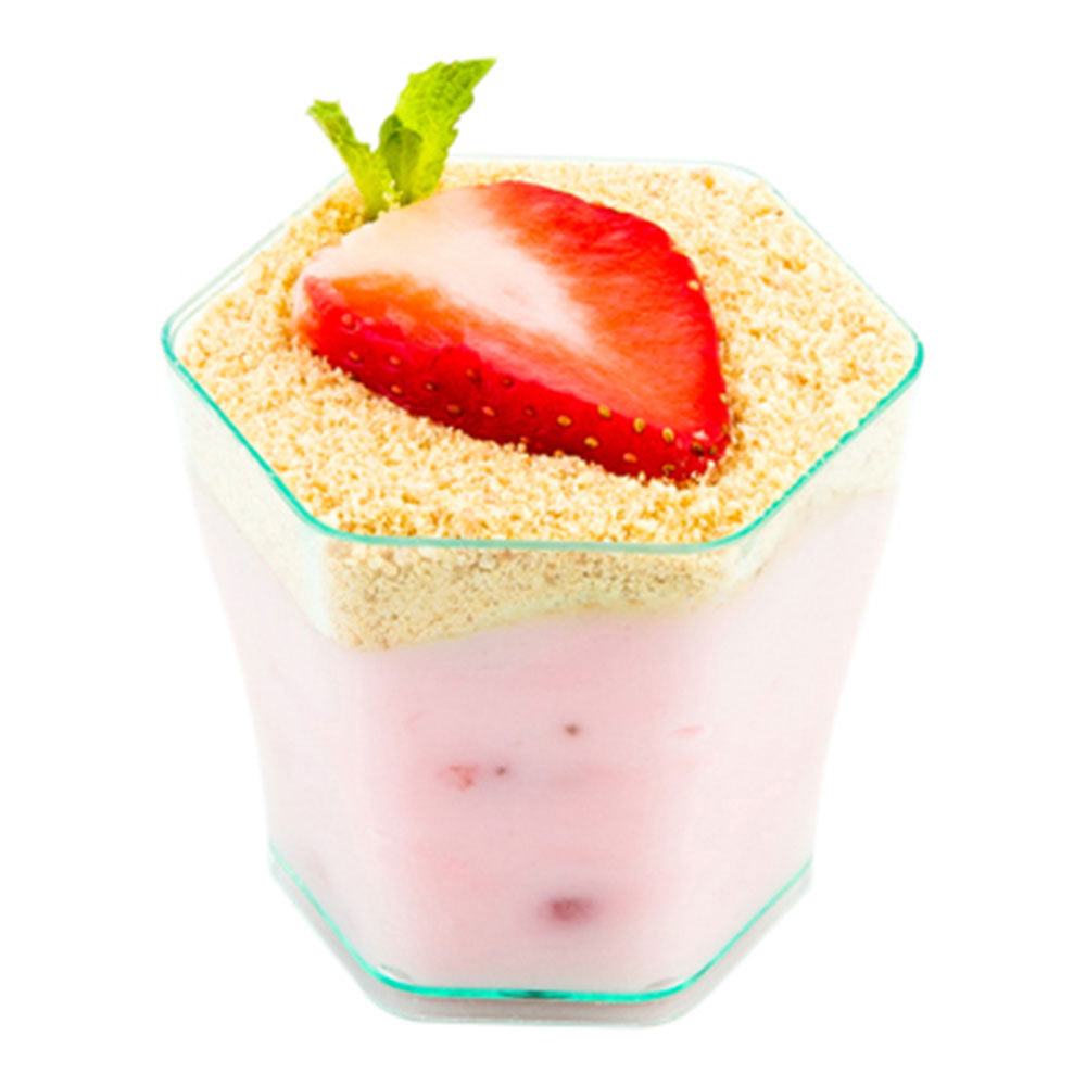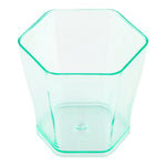 Impress your guests with an elevated presentation using our Mini Serve 2-ounce Hexagon Seagreen Plastic Glasses with Silver Plastic Mini Forks. Crafted from premium plastic, these appetizer cups are conveniently disposable to minimize cleanup after any event. These disposable cups have a translucent seagreen hue that will make a stylish statement at any cocktail party or tasting. With a capacity of 2 ounces, these hexagon-shaped glasses are ideal for serving bite-sized treats like miniature cheesecake, truffles, or fruit salads. Each plastic fork has a shiny silver finish, and when paired with these party glasses, they make an attractive duo for serving personal portions. These seagreen glasses measure 1.75 inches long by 1.75 inches wide by 1.75 inches tall and have a capacity of 2 ounces, while the cake forks measure 4 inches long. Each order includes 100 glasses and 100 forks.