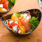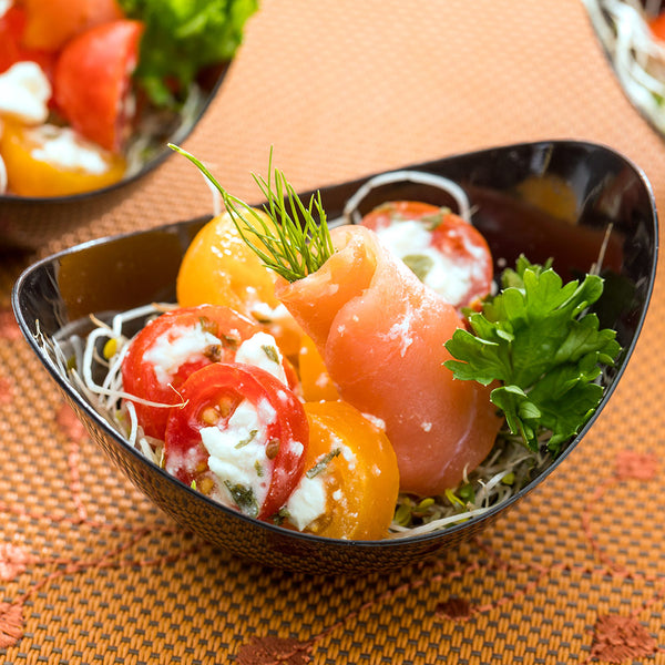 Elevate your appetizer presentation with our Bundle: Mini Serve 100 2-ounce Oval Black Plastic Alato Tasting Dishes with 100 Silver Plastic 4-inch Mini Spoons, offering a chic solution for your culinary delights. This bundle includes stylish tasting dishes and sleek silver plastic mini spoons, perfectly complementing each other. Crafted from premium plastic, these appetizer cups and spoons do not crack or warp easily for reliable use. The contemporary design and elegant black finish of these plastic cups add intrigue to your table setting. These plastic spoons feature a shiny finish, effortlessly enhancing the presentation of your tantalizing dishes. The sturdy handles of these 4-inch spoons stand up to hefty bites and big scoops, making them versatile for various appetizers and desserts. These disposable cups and spoons can be discarded after use, facilitating an easy cleanup. Measuring 3.5 inches in length by 2.75 inches in width by 1.75 inches in height, these dessert cups can hold up to 2 ounces of food. Each order includes 100 dishes and 100 spoons.