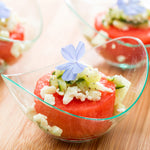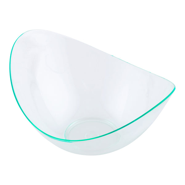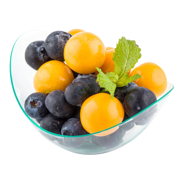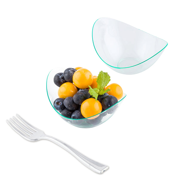 Impress your guests with an elegant tablescape using our Mini Serve 2-ounce Oval Seagreen Plastic Alato Tasting Dishes with Silver Plastic Mini Forks. These candy dishes feature curved edges and a stylish tinted-seagreen finish to elevate the presentation of any hors d'oeuvre or dessert instantly. The premium plastic construction of these serving dishes and appetizer forks makes them conveniently disposable for an easy post-event cleaning process. These disposable bowls have a capacity of 2 ounces and are the perfect size to showcase artisanal chocolates or miniature fruit tarts. Pair these oval bowls with the silver plastic forks to complete an upscale table setting. These mini forks have sturdy handles for enjoying hearty bites of polenta and creamy scoops of gelato without bending or breaking. Measuring 3.5 inches in length by 2.75 inches in width by 1.75 inches in height, these party dishes have a capacity of 2 ounces, while the plastic forks measure 4 inches in length. Each order includes 100 dishes and 100 forks.