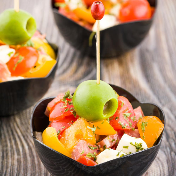 Elevate any catered event with our Mini Serve 2-ounce Round Black Plastic Le Fleur Cups with Silver Plastic Mini Forks. Made from high-quality plastic, these round cups are sturdy enough to securely hold fruit, shrimp, and other delectable hors d'oeuvres, while the shiny silver forks are designed to pierce polenta and scoop gelato effortlessly. These parfait bowls and cake forks are disposable to streamline your cleaning process. Featuring a floral design and black finish, these dessert cups are a stylish alternative to traditional plasticware and hold up to 2 ounces of your favorite bite-sized fare. The included dessert forks have a shiny silver finish to lend an elegant touch while easily spearing strawberry shortcakes and tuna tartare. These black cups measure 2.25 inches in length by 1.5 inches in width by 1.25 inches in height and have a capacity of 2 ounces, while the plastic forks measure 4 inches in length. Each order includes 100 cups and 100 forks.