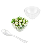 100 2 OZ ROUND CLEAR COPPA BOWLS AND 100 SILVER 4" SPOONS