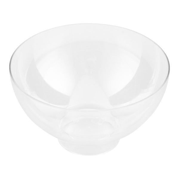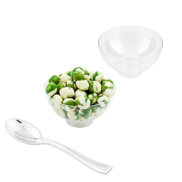 Elevate your presentation with our Bundle: Mini Serve 100 2-ounce Round Clear Plastic Coppa Bowls with 100 Silver Plastic 4-inch Mini Spoons. This bundle includes our clear plastic coppa bowls and silver plastic mini spoons, providing a complete set for serving delectable bite-sized delights. Made from premium plastic, these food bowls and spoons ensure durability and reliability, preventing breakage. These serving bowls have a clear finish and beautifully showcase your culinary creation. With a refined raised base, these serving dishes creates an exquisite display for miniature desserts, tapas, and hors d'oeuvres at weddings, cocktail parties, and catered affairs. Complementing the bowls, these plastic spoons feature a shiny finish, effortlessly enhancing the presentation of your tantalizing dishes. Equipped with sturdy handles, these 4-inch spoons can withstand hefty bites of polenta or big scoops of gelato. These plastic serving bowls and spoons are disposable and can be discarded after use, facilitating an efficient cleanup. Measuring 2.5 inches in diameter by 1 inch in height, these disposable bowls can hold up to 2 ounces. Each order includes 100 bowls and 100 spoons.