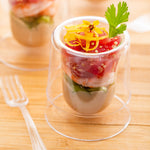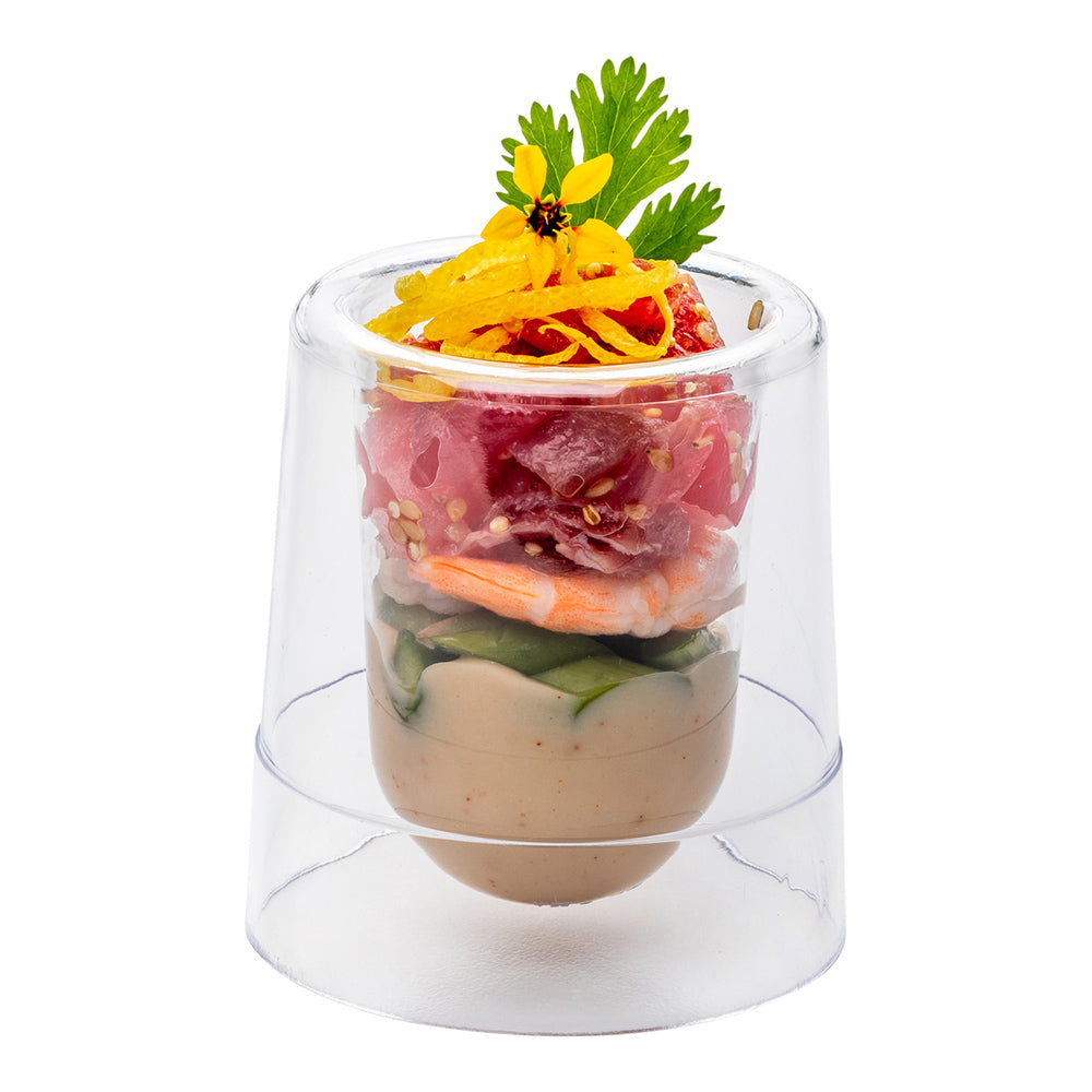 Elevate your culinary presentations with our Bundle: Mini Serve 100 2-ounce Round Clear Plastic Double Walled Cups with 100 Silver Plastic 4-inch Mini Spoons, designed to impress your guests. This bundle includes elegantly designed 2-ounce double-walled clear plastic cups and sleek silver plastic mini spoons, allowing you to serve a wide range of delectable treats in style. Made from premium plastic, these disposable cups and spoons are durable and do not crack or warp easily. The double-wall design of these appetizer cups creates a visually striking, centered appearance, perfect for serving ice cream, parfaits, yogurts, fruits, or other sweet delights at weddings, banquets, or catered events. The transparent finish of these dessert cups allows you to showcase your culinary creations with flair. Complementing the cups are these plastic spoons with a shiny silver finish, meticulously crafted to effortlessly enhance the presentation of your tantalizing dishes. With sturdy handles, these 4-inch spoons can handle hefty bites of polenta and generous scoops of gelato. These plastic cups measure 2 inches in diameter by 2.5 inches in height and can hold up to 2 ounces. Each order includes 100 cups and 100 spoons.