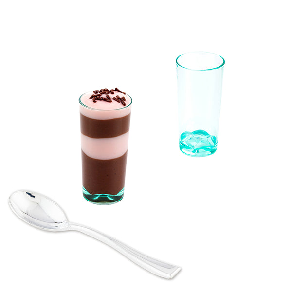 Elevate your entertaining experience with our Bundle: Mini Serve 100 2-ounce Round Seagreen Plastic Cannello Shot Glasses with 100 Silver Plastic 4-inch Mini Spoons, offering a seamless blend of style and functionality. This bundle includes shot glasses and spoons. Manufactured from premium plastic, these disposable shot glasses and spoons provide unparalleled strength and endurance, ensuring they can withstand even the most festive gatherings and extended evening events. Featuring a stunning seagreen hue, these plastic shot glasses allow your colorful mixes to pop, creating a visually stunning display. Designed with a stackable blueprint, these plastic shot cups facilitate effortless storage and movement, conserving your space and reducing workload. Featuring a shiny silver finish, these plastic spoons effortlessly enhance the presentation of your tantalizing dishes. These 4-inch spoons have sturdy handles and can withstand hefty bites of polenta or gelato. For an easy cleanup, these appetizer cups and spoons are disposable and can be discarded after use. Measuring 1.5 inches in diameter by 3 inches in heigh, these parfait cups can hold up to 2 ounces. Each order includes 100 glasses and 100 spoons.