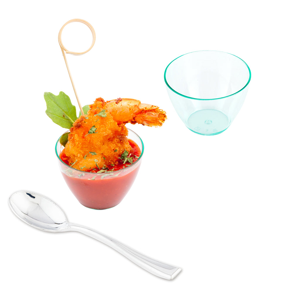 Create visually appealing table settings with our Bundle: Mini Serve 100 2-ounce Round Seagreen Plastic Mini Tasting Bowls with 100 Silver Plastic 4-inch Mini Spoons. This bundle includes seagreen mini bowls crafted from durable polystyrene plastic, boasting strength, and charm for an elegant food display. The exquisite seagreen finish of these plastic spoons lends a modern sophistication to your table settings, ideal for serving cold appetizers to dessert samples. These disposable bowls allow for effortless cleanup after use, while the round design highlights their versatility. Accompanying the bowls are silver plastic mini spoons with a shiny finish designed to enhance the presentation of your tantalizing dishes. These 4-inch spoons feature sturdy handles, perfect for hefty bites and scoops of polenta or gelato. Made from premium plastic, these bowls and spoons are conveniently disposable. Each bowl can comfortably hold up to 2 ounces of food, measuring 2 inches in diameter by 1.5 inches in height, while these spoons measure 4 inches in length. Each order includes 100 seagreen mini tasting bowls and 100 silver plastic mini spoons.