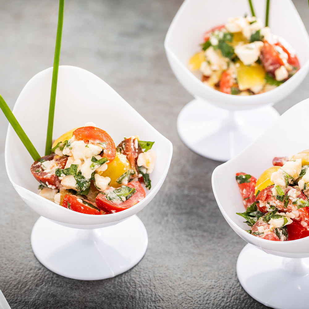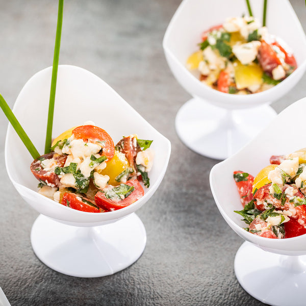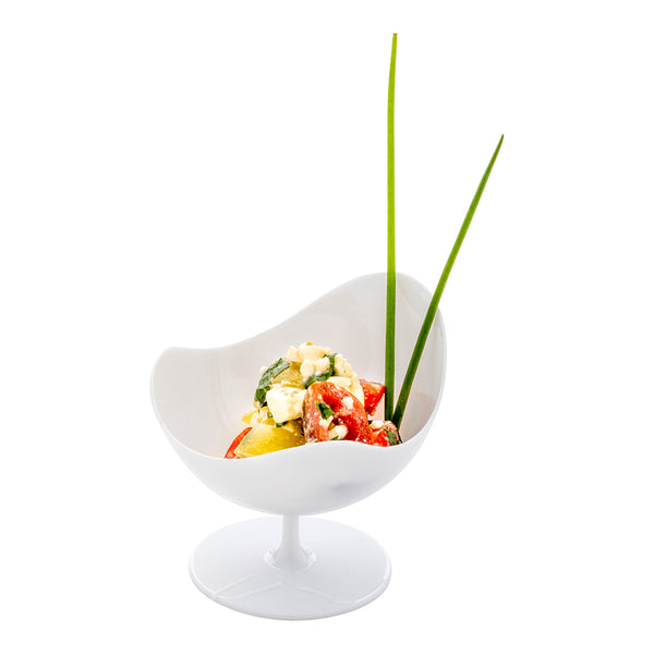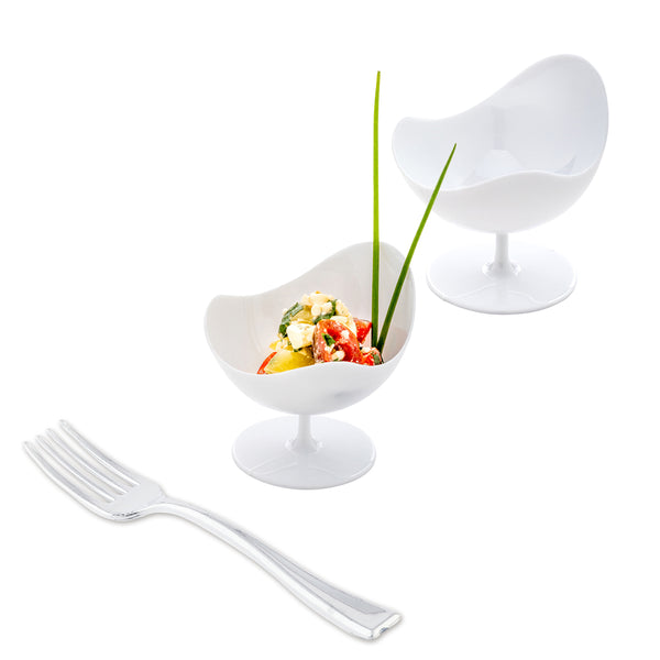 Provide your patrons with an elegant dining experience with our Mini Serve 2-ounce Round White Plastic Ball Chair with Silver Plastic Mini Forks. Made from premium plastic, these mini tasting cups and cake forks are as durable as they are disposable, allowing you to serve miniature portions of ceviche or sorbet without worrying about breakage or excess waste. These appetizer cups have a a sleek white finish and tapered, ball-shaped design, adding visual intrigue to any tablescape. With a capacity of 2 ounces, these disposable cups are perfect for single servings of your signature appetizers or desserts. These shiny silver plastic forks and white cups creates an attractive duo that makes an eye-catching addition to catered lunches, wedding receptions, and upscale cafes. Measuring 2.75 inches in diameter by 2.75 inches in height, these round food cups can hold up to 2 ounces, while the plastic forks measure 4 inches in length. Each order includes 100 cups and 100 forks.