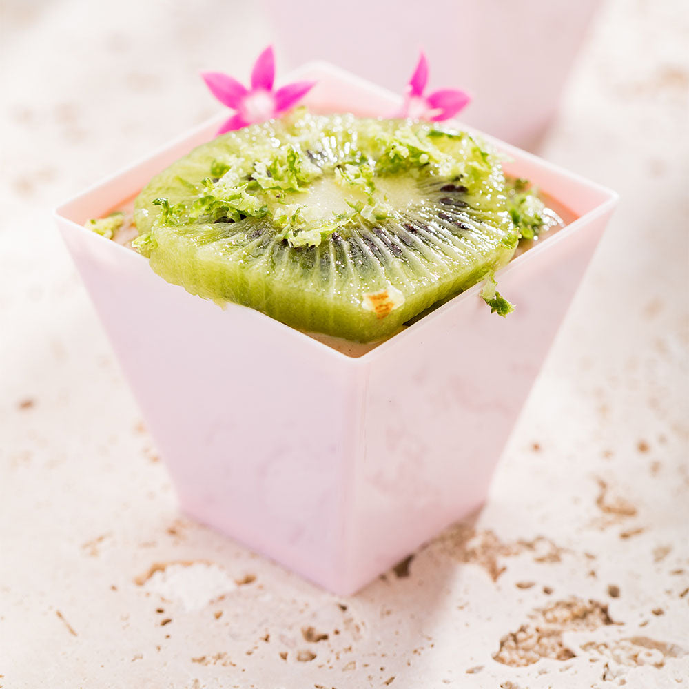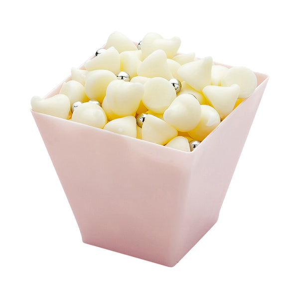 Serve up delectable mini desserts, yogurts, puddings, sundaes, candies, or appetizers in style with our Mini Serve 2-ounce Square Powder Pink Plastic Mini Kova Cups with Silver Plastic Mini Forks. Featuring a soft, powder pink finish, these dessert cups create an elegant look for your food presentation, while the silver finish of the cake forks lends a classy touch. These food cups and mini forks are made from premium plastic and are a perfect serving option for various foodservice establishments as they are disposable for a swift cleanup. Holding up to 2 ounces, these powder pink cups are ideal for miniature desserts and appetizers. These 4-inch forks are designed to effortlessly enhance the presentation of your tantalizing dishes and stand up to hefty bites with their strong and sturdy handles. Pair these appetizer cups with their coordinating lids (SKU: RWP0305C) to form a tight-fitting seal for a mess-free serving solution. These square cups measure 2 inches long by 2 inches wide by 1.75 inches tall and have a capacity of 2 ounces, while the plastic forks measure 4 inches long. Each order includes 100 cups and 100 forks. Lids are available and sold separately.