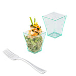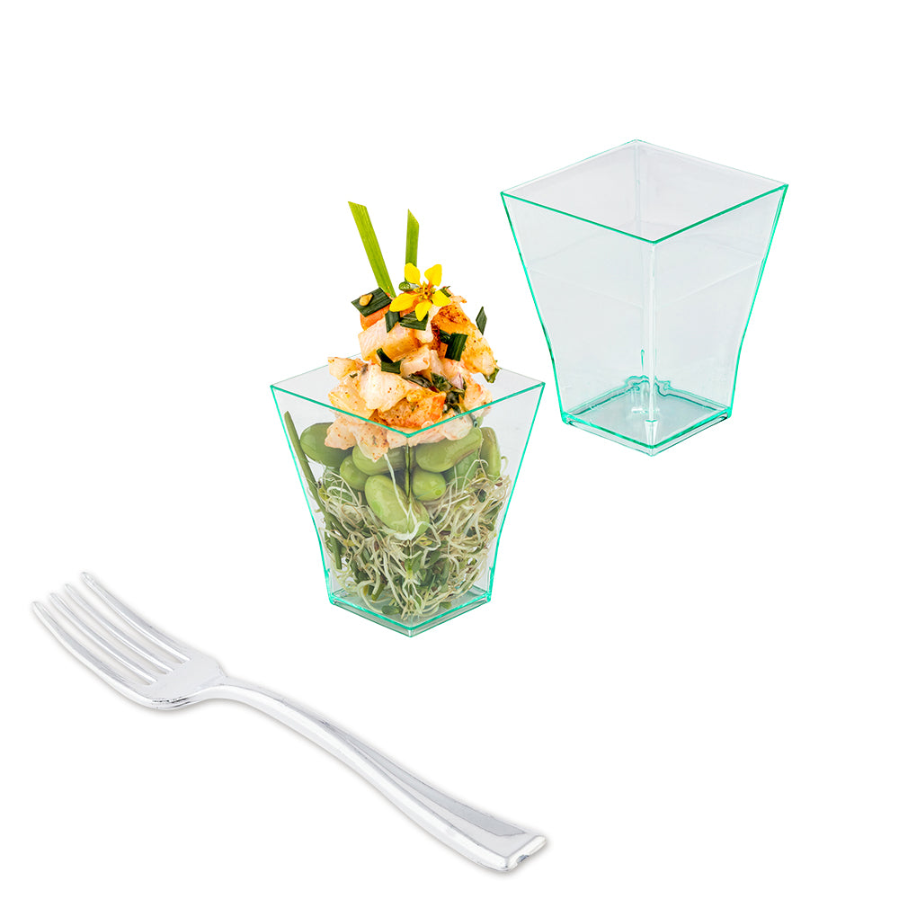 100 2 OZ SQUARE SEAGREEN PLASTIC BONITO CUPS AND 100 MINI FORKS