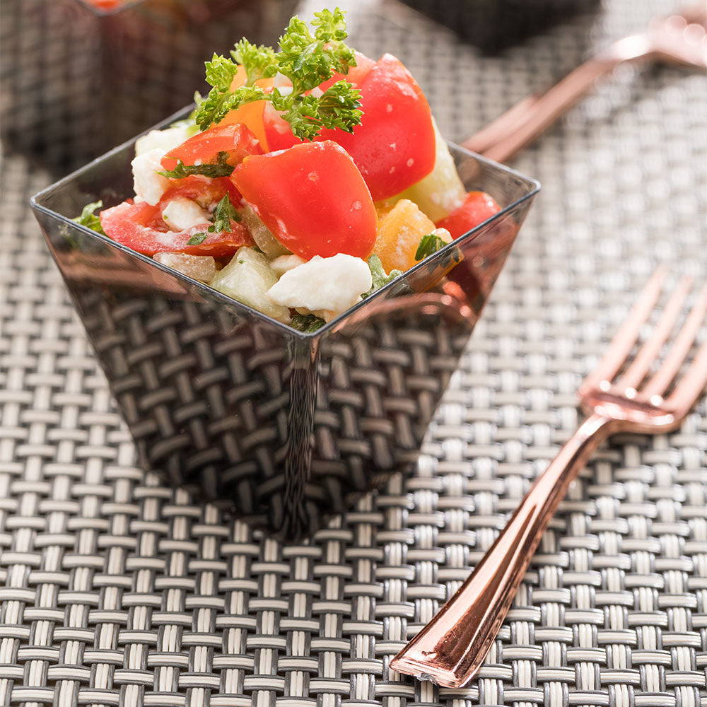 Serve miniature treats with our Mini Serve 2-ounce Square Smoked Gray Plastic Mini Kova Cups with Silver Plastic Mini Forks. Made from premium plastic, these dessert cups and cake forks are conveniently disposable for a hassle-free cleanup after meals. Featuring a sleek cube design and smoked gray hue, these food cups make an eye-catching addition to restaurant tables, catered buffets, and cocktail parties. To accompany these sophisticated cups, the included tasting forks have a polished silver finish that effortlessly elevates your presentation. These 4-inch forks are ideal for spearing decadent bites of chocolate mousse cake, lemon tartlets, and tiramisu. Holding up to 2 ounces, these mini cups are suitable for serving single portions of sorbet, creme brulee, or cheesecake. Pair these appetizer cups with their coordinating lids (SKU: RWP0305C) for a tight-fitting seal to lock in flavors. These square cups measure 2 inches long by 2 inches wide by 1.75 inches tall and have a capacity of 2 ounces, while the plastic forks measure 4 inches long. Each order includes 100 cups and 100 forks. Lids are available and sold separately.
