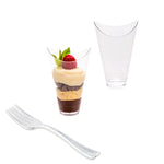 100 3 OZ CLEAR PLASTIC MINI MEZZALUNA CUPS AND 100 MINI FORKS