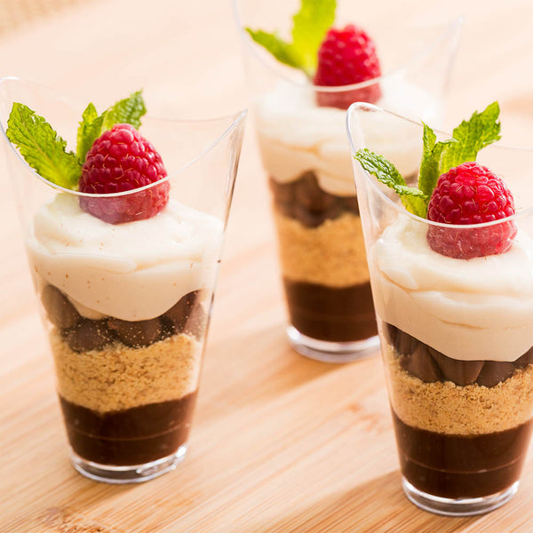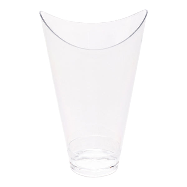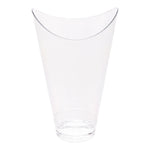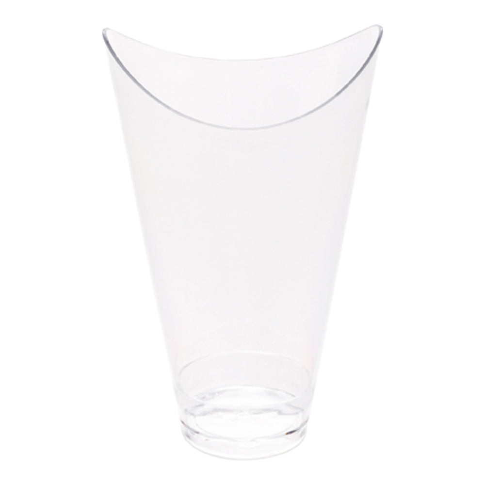 Elevate your dessert presentation and add an elegant touch to any table setting with Mini Serve 3-ounce Clear Plastic Mini Mezzaluna Cups with Silver Plastic Mini Forks. Made of premium PS plastic, these parfait cups and appetizer forks are conveniently disposable, perfect for a swift cleanup. These plastic cups have a clear, transparent finish that allows you to showcase decorative layering and plating skills, while the curved rim offers a sleek, modern take on standard dessert cups. Holding up to 3 ounces, these dessert shooters are ideal for serving cocktail shots, tasting samples at food and wine festivals, or miniature portions of mousse, custard, and chocolate cake. Featuring a shiny silver finish, the included mini forks are designed to effortlessly enhance the presentation of your dishes while the sturdy handles allow them to stand up to substantial bites. These dessert cups measure 3.25 inches long by 2 inches wide by 1.5 inches tall and have a capacity of 3 ounces, while the plastic forks measure 4 inches in length. Each order includes 100 cups and 100 forks.