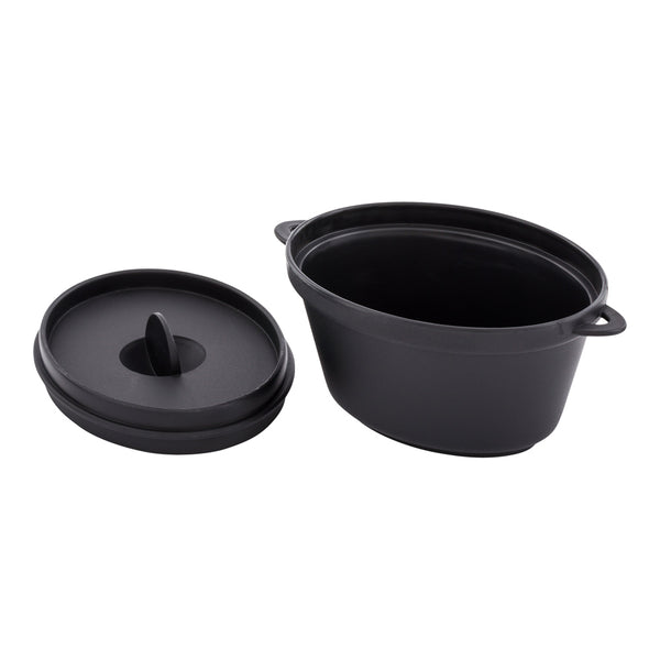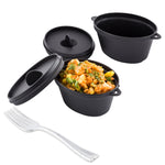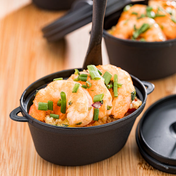 Present savory appetizers with our Mini Serve 3-ounce Oval Black Plastic Mini Kettle Dishes with Silver Plastic Mini Forks. Constructed from high-quality plastic, these serving dishes and cake forks are conveniently disposable to provide a swift post-meal cleanup without any stress. These plastic bowls with lids can hold up to 3 ounces and are ideal for serving single portions of your signature appetizers or desserts. Inspired by the look of cast iron Dutch ovens, these black bowls elevate any food presentation's look with a rustic flair. With a tight-fitting lid, these plastic serving bowls offer an ideal solution for take outs. These appetizer forks have a shiny silver finish that complements every tablescape. With sturdy, strong handles, these 4-inch forks can effortlessly scoop up big bites of your food without bending or breaking. The durable construction of these plastic kettle dishes makes them ideal for serving various cold food items. These black bowls measure 3 inches long by 2.25 inches wide by 1.5 inches tall and have a capacity of 3 ounces, while the plastic forks measure 4 inches long. Each order includes 100 dishes and 100 forks.