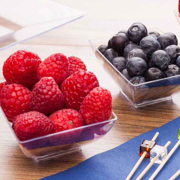 Elegantly serve delectable bites at your next catered event with our Mini Serve 3-ounce Rectangle Clear Plastic Small Architetto Bowls with Silver Plastic Mini Forks. Made from high-quality plastic, these candy bowls and cake forks are disposable, guaranteeing an easy post-event cleanup. These dessert bowls feature a crystal clear finish and modern rectangle design, stylishly displaying miniature appetizers, desserts, and snacks, while the shiny silver 4-inch forks effortlessly enhance your tantalizing dishes. Holding up to 3 ounces, these rectangle bowls are perfect for showcasing single portions of mixed berry yogurt parfaits or chocolate-coated almonds. Each dessert fork has sturdy handles built to withstand hearty portions of polenta and gelato. These clear bowls measure 3.25 inches long by 2.25 inches wide by 1.25 inches tall and have a capacity of 3 ounces, while the included plastic forks measure 4 inches long. Each order includes 100 bowls and 100 forks.