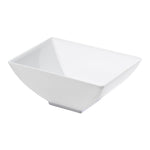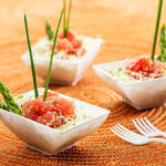 Dazzle your guests with an elegant tabletop experience using our Mini Serve 3-ounce Rectangle White Plastic Small Architetto Bowls with Silver Plastic Mini Forks. These dessert bowls and cake forks are crafted from premium plastic, which makes them disposable, ideal for events that prefer swift after-service cleanup. Featuring a sleek white finish and a modern rectangular design, these candy bowls upgrade any presentation while the shiny finish of the 4-inch forks lends an elegant touch. These rectangle bowls have a capacity of 3 ounces and are ideal for serving gourmet miniature appetizers, desserts, or tasting menu courses at upscale restaurants and events. The sturdy handles of these mini forks are built to stand up to hearty fare without bending or breaking. These white bowls measure 3.25 inches long by 2.25 inches wide by 1.25 inches tall and have a capacity of 3 ounces, while the included plastic forks measure 4 inches long. Each order includes 100 bowls and 100 forks.