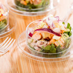 Give your miniature culinary creations a stylish stage with our Mini Serve 3-ounce Round Clear Plastic Gastronomique Petri Dishes with Silver Plastic Mini Forks. Featuring an innovative circular shape, these serving dishes elevate the presentation of your delectable hors d'oeuvres and petite desserts. These plastic dishes have a crystal clear finish, and guests will delight in viewing each layer of your sweet or savory treats. With a capacity of 3 ounces, these disposable serving dishes are perfect to artfully display mini red velvet cakes at your next catered soiree or to serve bite-sized spinach quiche at your upcoming luncheon fashionably. Constructed from premium plastic, these food trays and cake forks are disposable, ensuring swift and straightforward cleanup after your event. These 4-inch forks have a shiny silver finish that effortlessly enhances the appearance of your tantalizing dishes, and their durable handles can withstand substantial bites of polenta and large scoops of gelato. Measuring 3.25 inches in diameter by 1 inch in height, these round dishes hold up to 3 ounces, while the included plastic forks measure 4 inches in length. Each order includes 100 dishes and 100 forks.