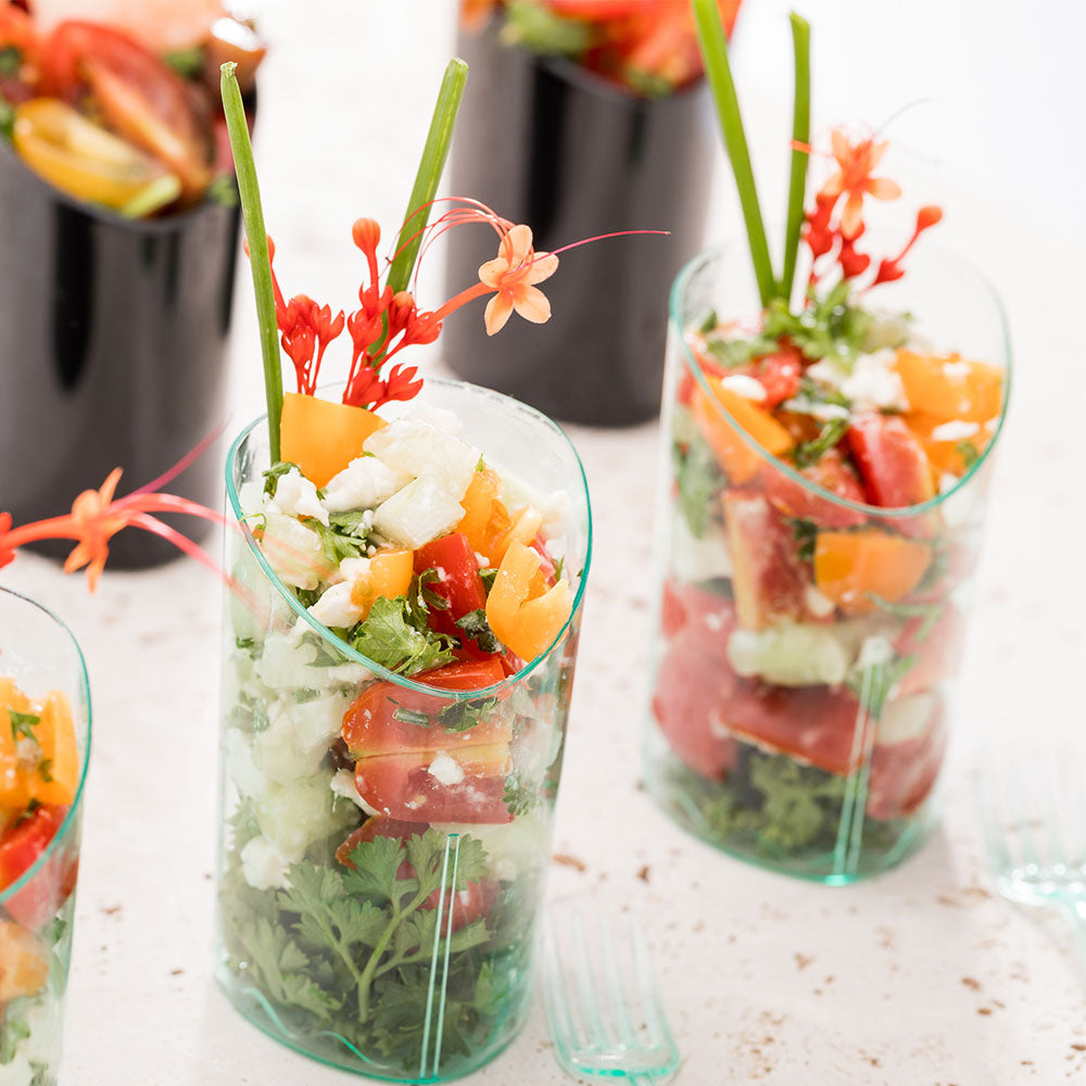 Design elegant serving stations with our Bundle: Mini Serve 100 3-ounce Seagreen Plastic Triangolo Shot Glass with 100 Silver Plastic 4-inch Mini Spoons. This bundle includes our 3-ounce seagreen plastic triangolo shot glasses, crafted from durable plastic to withstand lively gatherings and lengthy celebrations, and our silver plastic mini spoons, featuring a shiny silver finish to enhance the presentation of your tantalizing dishes. The distinctive triangular form of these shot glasses imparts an instant sense of sophistication to your beverages, while their charming seagreen hue showcases vivid creations. These disposable shot glasses streamline post-event cleanup, allowing you to relish the occasion alongside your guests. These stackable shot glasses save storage space and effort, while their chic appearance and 3-ounce capacity ensure perfect pourings. Complementing the shot glasses, these 4-inch silver plastic spoons are ideal for plating miniature appetizers like tuna tartare or personal-sized desserts, with sturdy handles that can handle hefty bites of polenta or scoops of gelato. With dimensions of 1.75 inches in diameter by 3 inches in height for the shot glasses and 4 inches in length for the spoons, this bundle offers the perfect combination for elevating your events. Each order includes 100 shot glasses and 100 mini spoons.