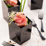 Impress your guests with an elegant presentation using our Mini Serve 3-ounce Square Black Plastic Incline Cups with Silver Plastic Mini Forks. Made from premium plastic, these square cups and tasting forks are conveniently disposable, ideal for easy after-service cleanup. These appetizer cups feature a square shape with a sloping edge that gives a chic look to your served appetizers. With a smooth black finish, these dessert cups add something exquisite and sophisticated to your table, elevating the overall aesthetic of your culinary presentation, while the shiny silver finish of these cake forks lends an elegant touch to your tablescape. These plastic cups can hold up to 3 ounces and are perfect for serving single portions of snacks. Measuring 1.75 inches long by 1.75 inches wide by 2.75 inches tall, these black cups have a capacity of 3 ounces, while the plastic forks measure 4 inches long. Each order includes 100 cups and 100 forks.