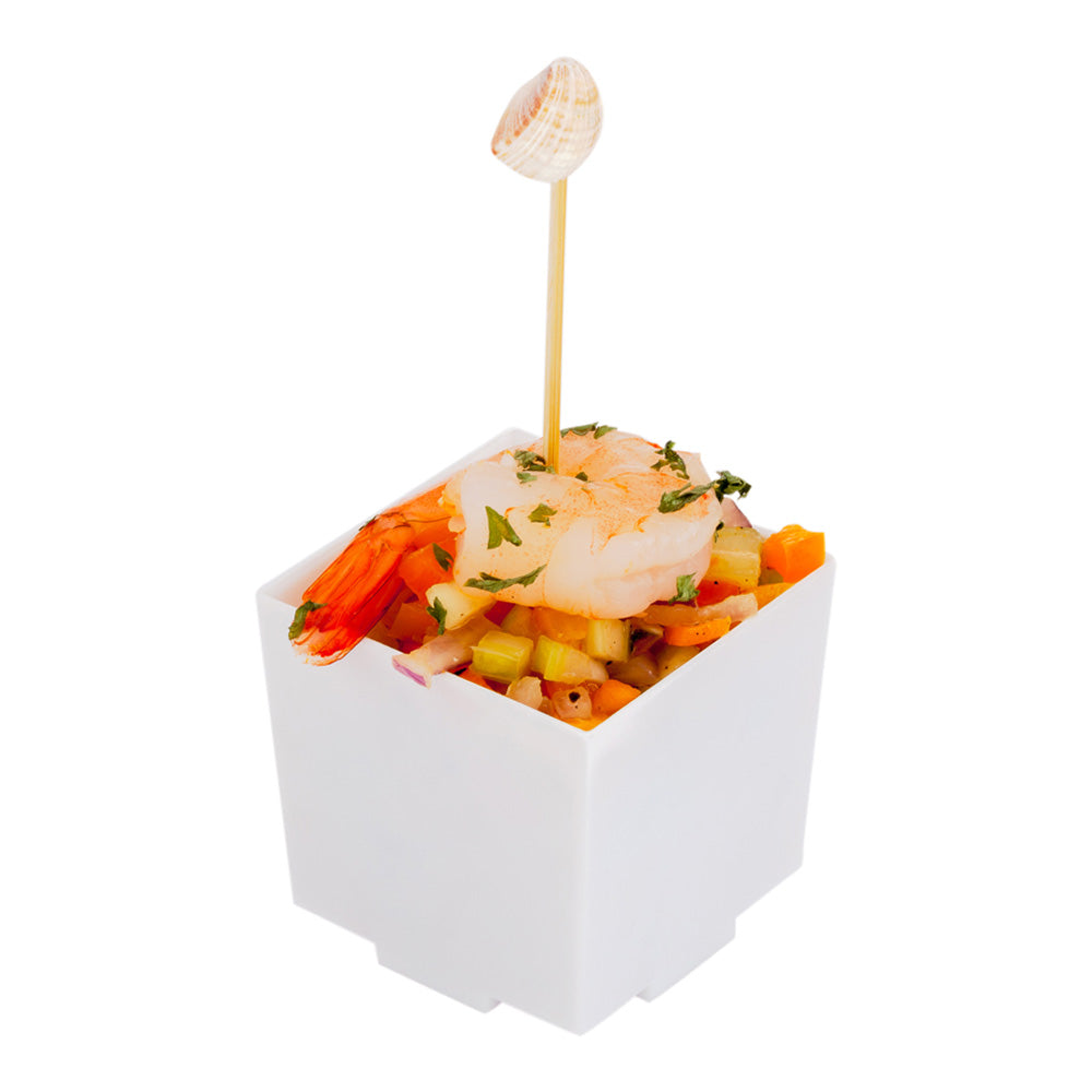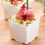 Delight your guests with our Mini Serve 3-ounce Square White Plastic Quadrato Cups with Silver Plastic Mini Forks. Carefully crafted from sturdy, high-caliber PS plastic, these dessert cups and cake forks are disposable for easy after-event cleanup. With a generous 3-ounce capacity, these pudding cups are perfect for showcasing a range of exquisite desserts, appetizers, and bites. The sleek, square design and wide lip of these white cups contribute to a sophisticated presentation, while the disposable forks add functionality, allowing guests to savor every bite. With a classic white finish, these parfait cups and the complementary silver mini forks contribute to a tasteful and appealing food presentation. These appetizer cups measure 1.75 inches in length by 1.5 inches in width by 1.75 inches in height and have a capacity of 3 ounces, while the tasting forks measure 4 inches in length. Each order includes 100 cups and forks.